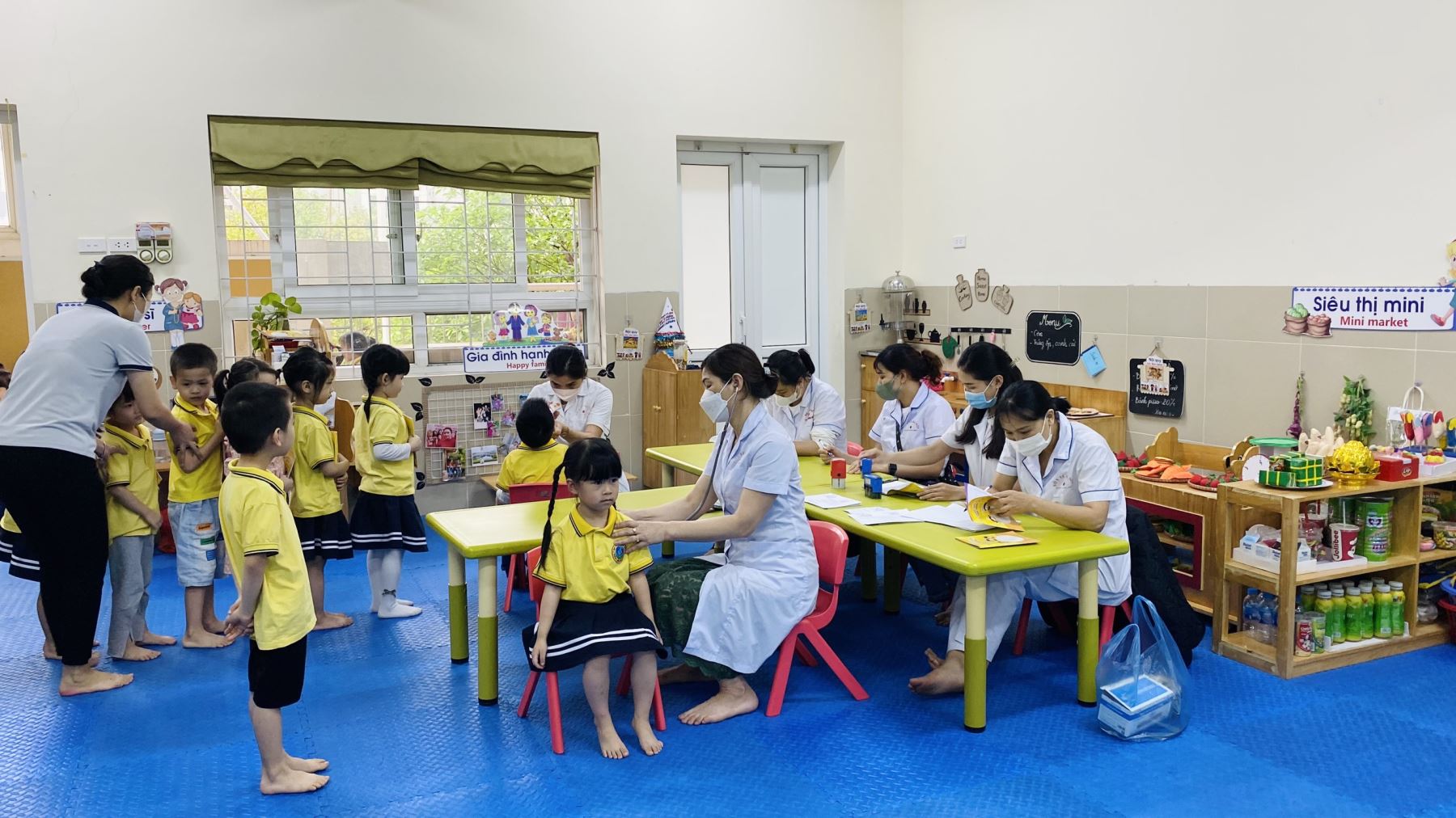 Thực hiện kế hoạch số 69 - KH/MNTA ngày 22/9/2022 về việc khám sức khỏe định kỳ cho trẻ. Hôm nay, nhà trường phối hợp với TTYT phường Giang Biên tổ chức khám sức khỏe đợt 2 cho toàn trẻ trong trường.