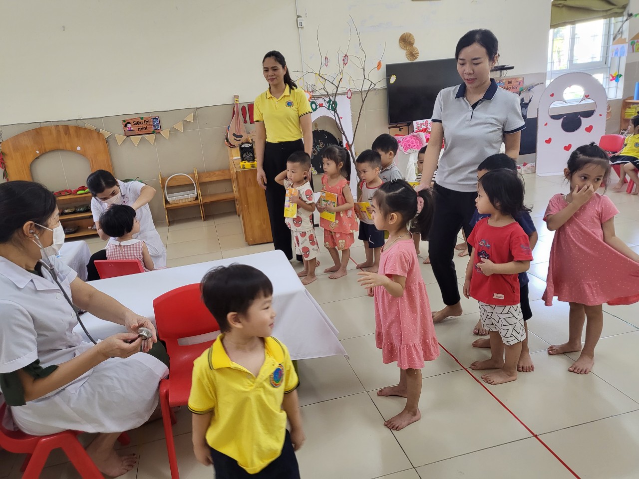 Dưới sự hướng dẫn tận tình của các cô giáo, các cháu đều có tâm lý vô cùng thoải mái và hợp tác tốt với các bác sỹ trong quá trình khám sức khỏe. Ý thức ngồi chờ đến lượt để khám, xếp hàng chờ đến lượt, lắng nghe lời dặn dò của bác sỹ, cám ơn bác sỹ khi đã khám xong cho mình.
