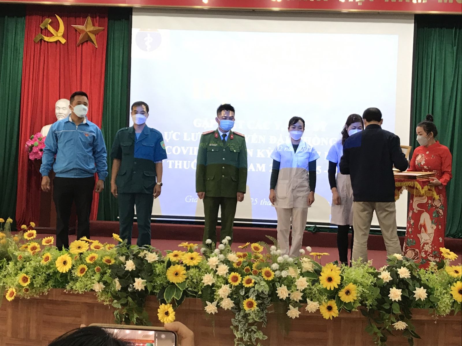 Đồng chí Dương Thị Thu Hương - Nhân viên Y tế của nhà trường ( đứng thứ 2 bên phải) đại diện cho Trạm y tế lưu động nhận giấy khen có thành tích xuất sắc trong công tác phòng chống dịch bệnh Covid-19
