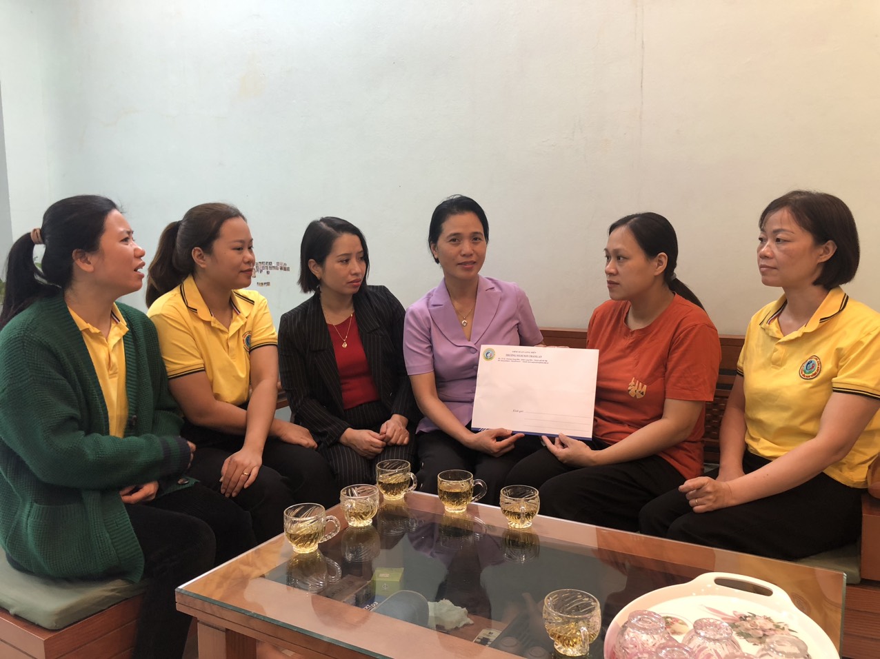 Thay mặt nhà trường, cô Nguyễn Thị Hương phó Hiệu Trưởng đã ân cần thăm hỏi, trao quà và động viên gia đình cô giáo Nguyễn Thu Hường. Đây là những tình cảm, sự sẻ chia của tập thể cán bộ giáo viên, nhân viên trong nhà trường gửi đến cô giáo; mong cô giáo Nguyễn Thu Hường luôn mạnh mẽ để tiếp tục chăm sóc chồng và các con vượt qua khó khăn!