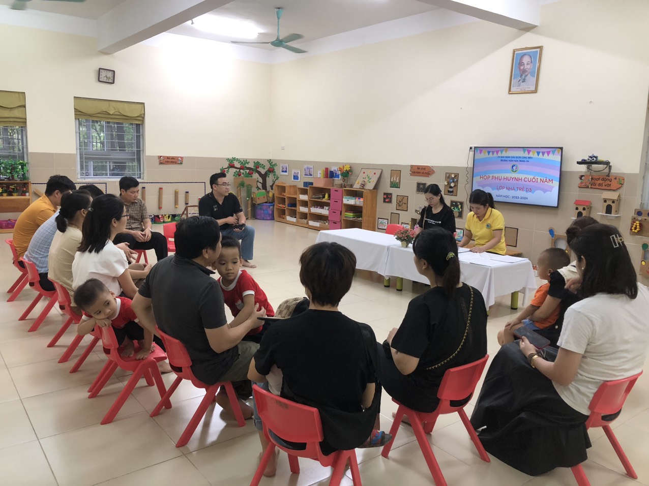 Cánh phượng hồng đã nở, tiếng ve sầu đã bắt đầu ngân nga trên những vòm lá báo hiệu một mùa hè nữa lại về. Vậy là một năm học nữa cũng đã thấm thoát trôi qua. Nhằm gắn kết tình cảm và khẳng định nhữngkết quả mà nhà trường MN Tràng An nói chung và lớp Nhà Trẻ D3 nói riêng đã đạt được là có sự đóng góp không nhỏ từ phía phụ huynh học sinh. Sự phối kết hợp tốt giữa Phụ huynh với giáo viên, giáo viên với phụ huynh đã làm nên những kết quả đáng trân trọng. Mặc dù rất bận công việc nhưng các bậc phụ huynh đã có mặt đúng giờ để dự buổi họp phụ huynh cuối năm. Dưới đây là một số hình ảnh của buổi họp phụ huynh lớp Nhà Trẻ D3