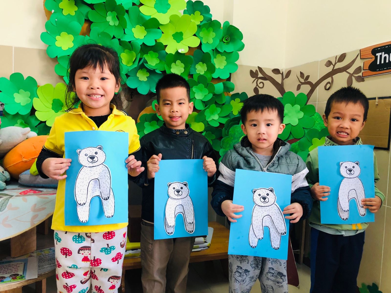 Bằng các nguyên vật liệu đơn giản như giấy mầu, giấy in hình chú Gấu và hồ dán. Các bé đã khéo léo dùng tay chấm hồ và dán, sắp xếp các bộ phận của chú Gấu để tạo thành bức tranh chú Gấu trắng vô cùng đáng yêu, ngộ nghĩnh đó ạ. Dưới đây là hình ảnh của giờ học: