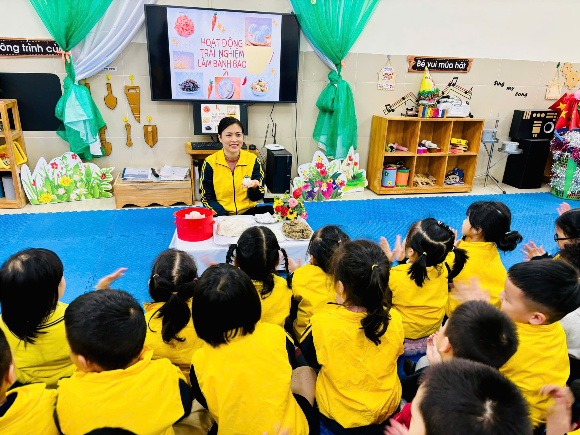 Các con hiểu được để làm ra chiếc bánh bao thơm ngon cần có các nguyên liệu và dụng cụ như: Bột mì, thịt lợn xay, mộc nhĩ, miến, ngũ vị hương, gia vị, dụng cụ hấp bánh, giấy nến. Dưới sự hướng dẫn của cô giáo, các con đã có kỹ năng nhào bột, chia bột xoay tròn, ấn bẹt tạo hình làm ra chiếc bánh bánh bao đẹp mắt.