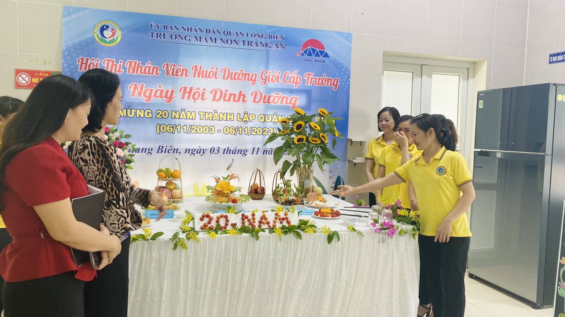 Đến với hội thi quy chế, nhân viên nuôi dưỡng giỏi cấp trường - Ngày hội dinh dưỡng các đồng chí nhân viên nuôi dưỡng của trường mầm non Tràng An. Ngày từ đầu giờ sáng đã nhộn nhịp tấp lập những tiếng cười vui cùng hòa những làm việc nghiêm túc ngay từ khâu giao nhận thực phẩm, sơ chế biến món ăn, chia định lượng món ăn cho trẻ và đâu đó mỗi đội thi chọn 1 vị trí sơ chế những món ăn mà đội đã lựa chọn hết mình mang những món ăn vô cùng hấp dẫn, hương vị lạ màu sắc bắt mắt có thể áp dụng với trẻ lứa tuổi mầm non nhằm kích thích trẻ ăn ngon miệng với các món ăn " Tôm chiên hoàng bào"; " Chả ốc Hà Nội", " Nem hải sản". Những món ăn 3 đội thi lựa chọn để tham gia được bầy biện bố trí đẹp mắt có cách bầy trí riêng phối vào món ăn của đội mình với hình tỉa tỉ mỉ đầu rồng, chùm hoa sắc màu..., Cả 3 đội thi đã thu hút sự tập trung BGK qua những lời thuyết trình ngắn gọn về quy trình cách chế biến món ăn riêng của đội mình.Sau phần thuyết trình của 4 đội, BGK đã có những nhận xét riêng cho từng đội về cách thức trình bầy, chất lượng món ăn rút kinh nghiệm cho các hội thi tiếp theo.