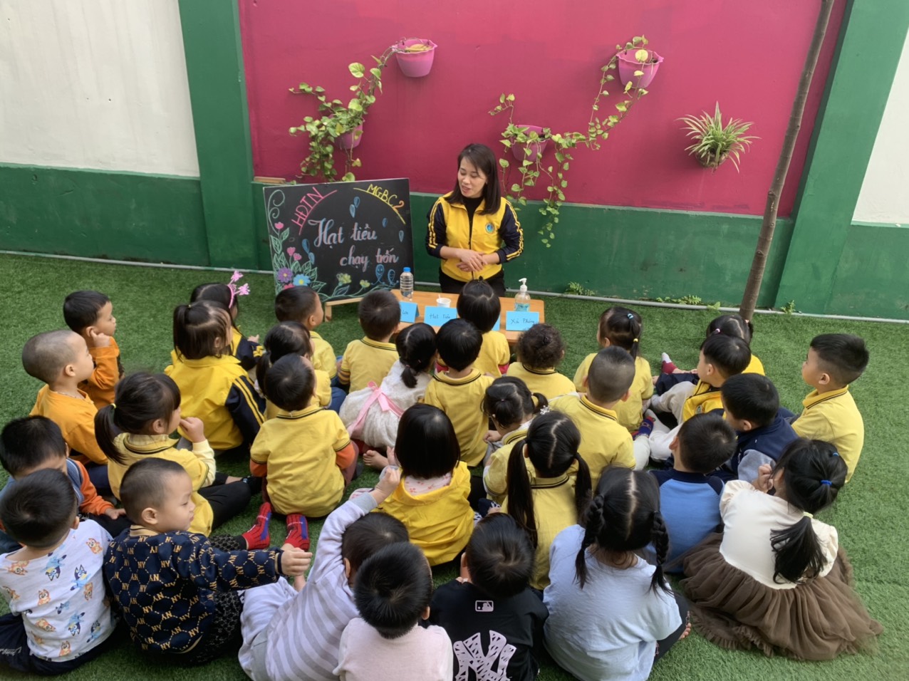 Với các nguyên liệu đơn giản là một chiếc đĩa, hạt tiêu đã xay nhỏ, nước và dung dịch xà phòng...Cô đã hướng dẫn các con thực hiện thí nghiệm hạt tiêu chạy trốn. Những hạt tiêu đen bé xíu kia giống như những con vi khuẩn. Đầu tiên, con rắc hạt tiêu vào nước, khi chấm đầu ngón tay vào, những “con vi khuẩn đáng ghét” kia sẽ bám dính lên tay con. Nhưng nếu như con chấm vào dung dịch xà phòng rồi sau đó lại bỏ đầu ngón tay vào chiếc đĩa kia, thì những hạt tiêu ngay lập tức di chuyển ra phía bên ngoài, giống như là sợ hãi liền bỏ chạy ra thật xa…