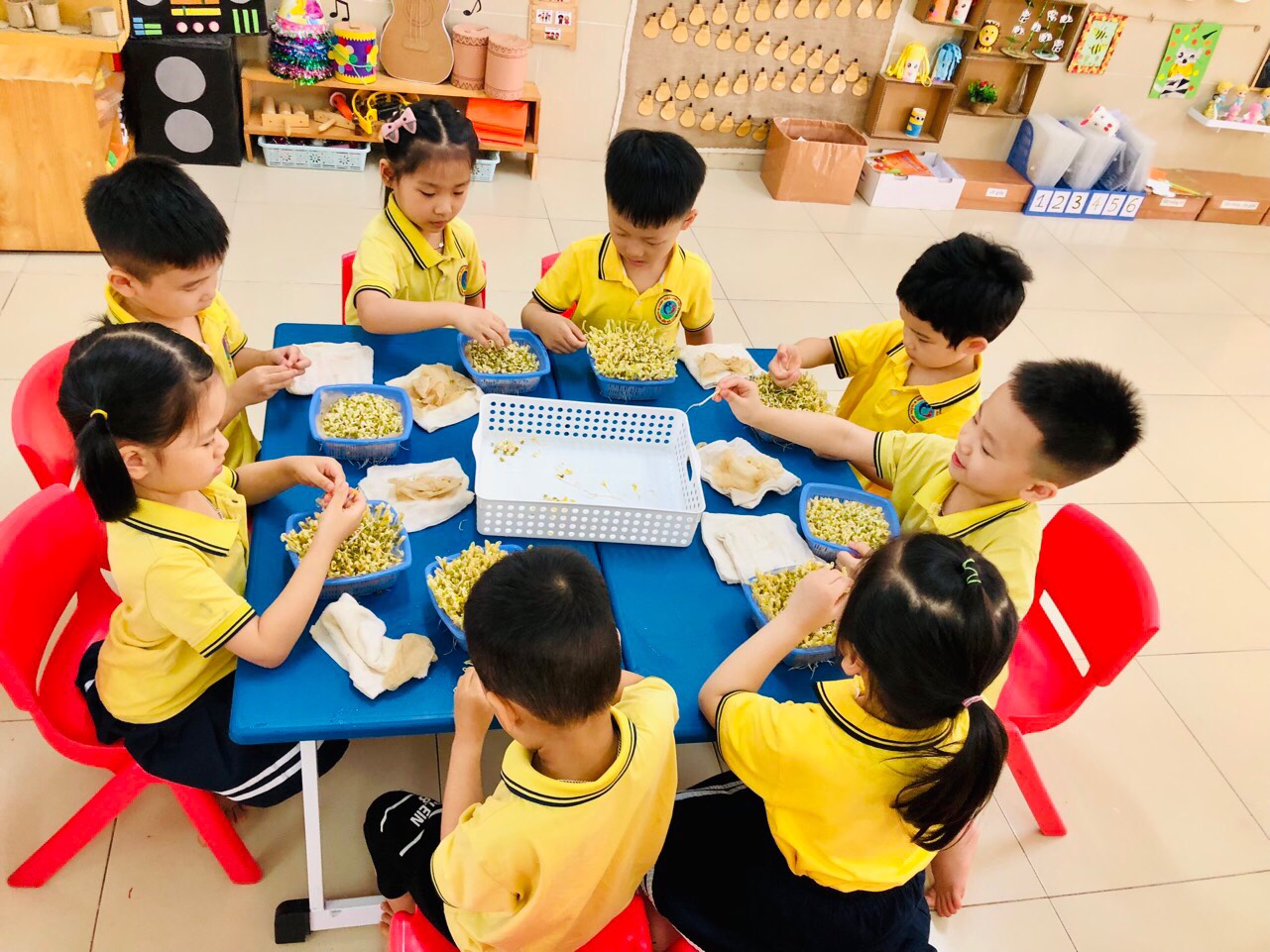 Từ ngày đầu tuần các con được cô giáo hướng dẫn cách lựa chọn đỗ, ngâm đỗ, rắc đều các hạt đỗ vào rổ đã được lót khăn giấy. Hàng ngày các con được trực tiếp tưới nước chăm sóc và quan sát quá trình phát triển từ hạt đỗ tới khi trở thành giá đỗ. Niềm vui, sự hân hoan hiện rõ trên khuôn mặt trẻ khi phát hiện ra sự thay đổi của hạt đỗ từng ngày.