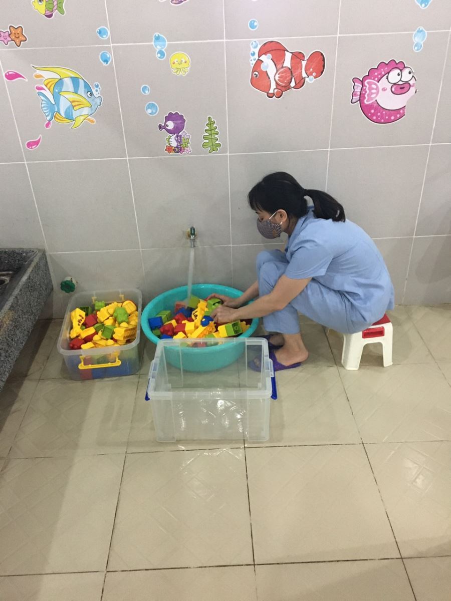 Sau 1 tuần đi học trở lại, hôm nay, chiều thứ 6 hàng tuần như thường lệ, lớp mẫu giáo nhỡ B4 – trường mầm non Tràng An tiếp tục công tác tổng vệ sinh trong và ngoài lớp học để đảm bảo sức khỏe cho các bé khi học tập tại trường, đặc biệt là phụ huynh có thể yên tâm công tác. Tại lớp học, toàn bộ đồ dùng đồ chơi được đánh rửa sạch sẽ bằng các chất tẩy rửa thông thường và phơi khô. Các giá góc chơi, được lau dọn và sắp xếp đồ dùng ngay ngắn. Với những nơi trẻ chơi thường xuyên, thực hiện khử khuẩn kỹ hơn bằng dung dịch cloramin B để đảm bảo vệ sinh. Tất cả các công việc được được tiến hành nhanh chóng, sạch sec gọn gàng đảm bảo an toàn tuyệt đối.