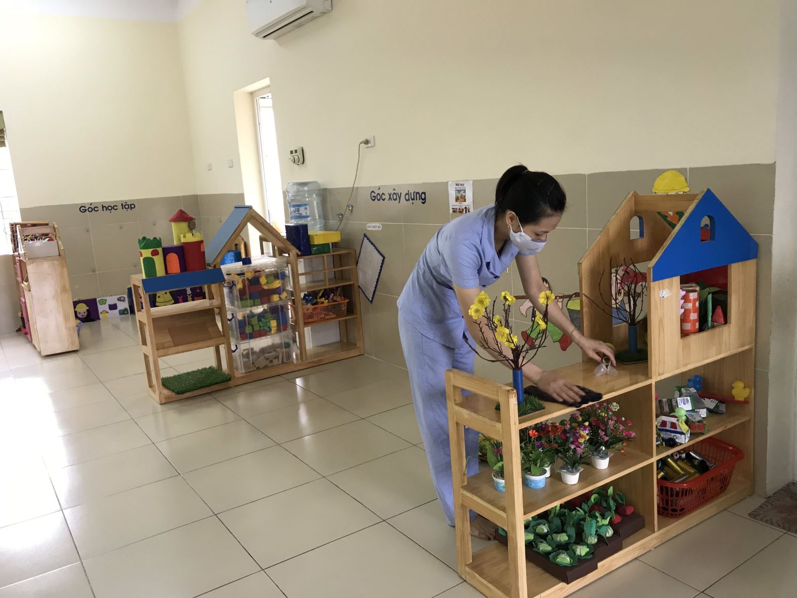 Đảm bảo cho trẻ có một môi trường hoạt động sạch sẽ, an toàn khi đến lớp trong đợt dịch Covid-19 đang bùng phát trở lại. Giáo viên lớp MGN B3 thực hiện nghiêm túc công tác vệ sinh khử khuẩn hàng ngày để phòng chống dịch theo chỉ thị của UBND Thành phố, Sở GD&ĐT TP Hà Nội và phương án phòng dịch bệnh của Trường MN Tràng An.