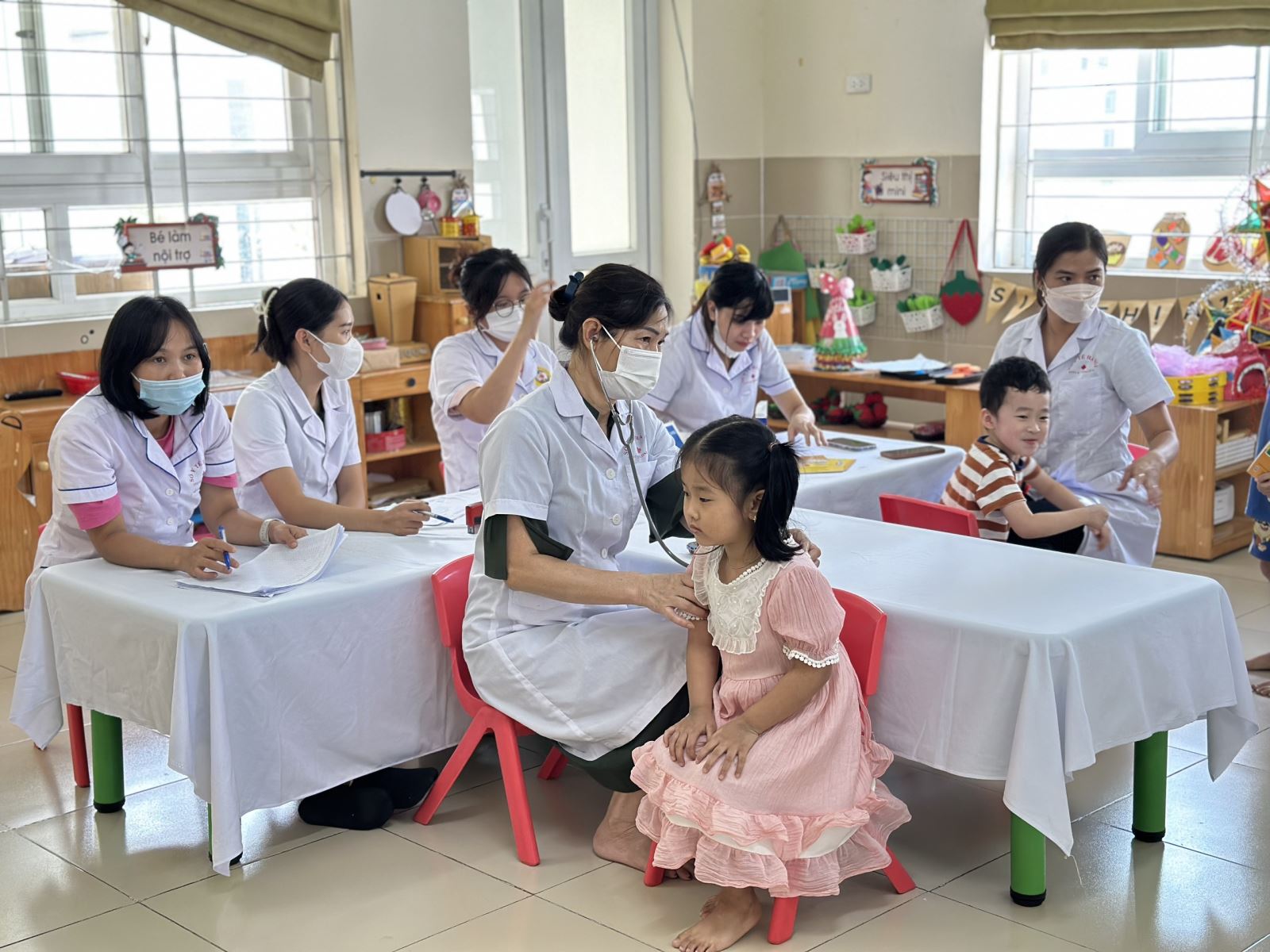 Với những phương pháp khám nhẹ nhàng, cởi mở, các bác sĩ đã tạo không khí vui tươi và hứng thú cho các bạn nhỏ. Sau buổi khám, kết quả khám sức khoẻ của các con sẽ được giáo viên thông báo cho phụ huynh học sinh.