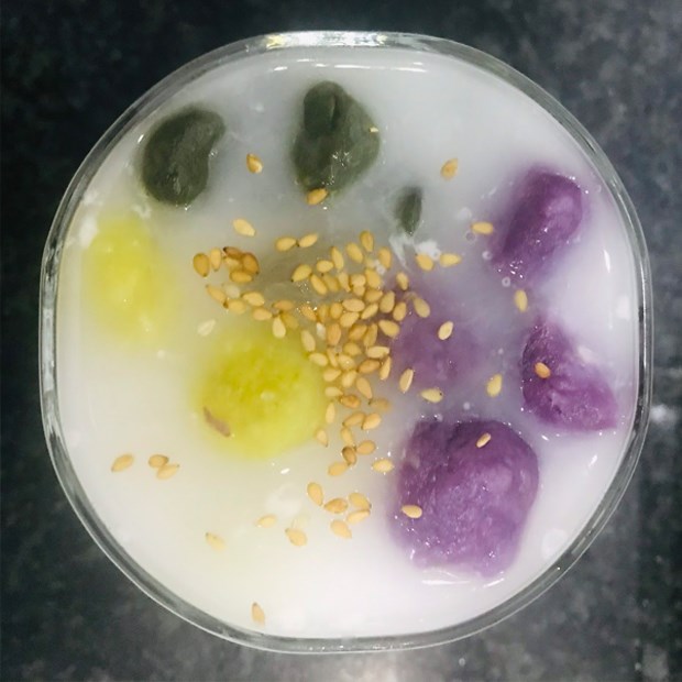 Cuối cùng, cho các viên bột vào ly, rưới lên trên mặt 1 ít nước cốt dừa, rắc thêm mè trắng rang là có thể thưởng thức.