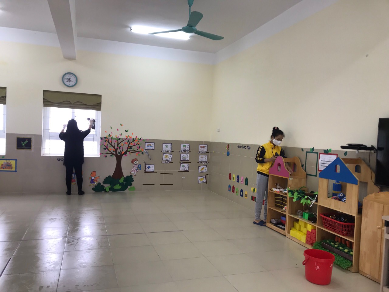 Giáo viên lớp MGL A4 tích cực phòng chống dịch bệnh viêm đường hô hấp cấp do chủng mới của virus corona qua việc thường xuyên vệ sinh lớp học, khử khuẩn đồ dùng, đồ chơi, giá đồ chơi, cửa sổ, cầu thang ... bằng dung dịch Cloramil B để đảm bảo môi trường trong và ngoài lớp học luôn sạch sẽ, an toàn cho trẻ.