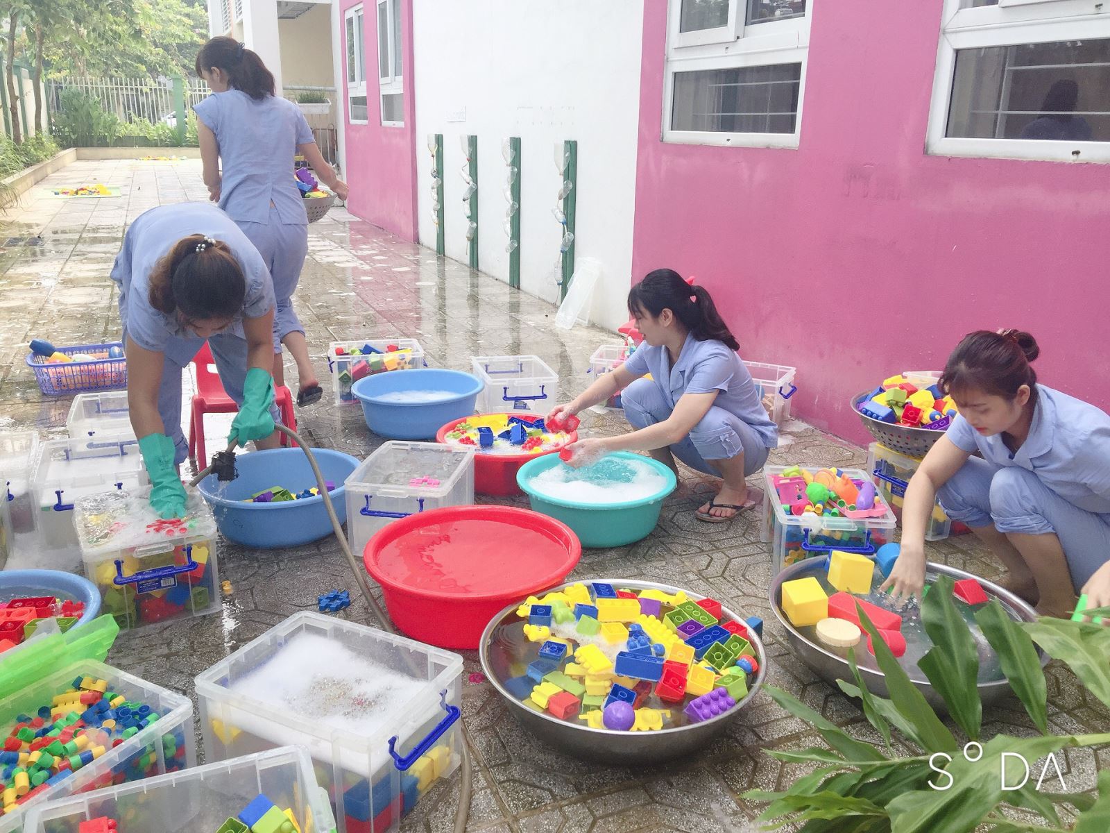 15/15 lớpvà bếp ăn của nhà trường đã tiến hành lau chùi các giá đồ chơi, cọ rủa sàn .ngâm đồ chơi với nước rửa xà phòng 15 phút sau đó cọ rửa và tráng lại nhiều lần bằng vòi nước sạch mang ra phơi nắng, hàng ngày cho trẻ rửa tay bằng xà phòng….. bên cạnh đó Nhân viên bếp lao công tiến hành cắt dọn cây thông thoáng môi trường, lau chùi tay vịn cầu thang …