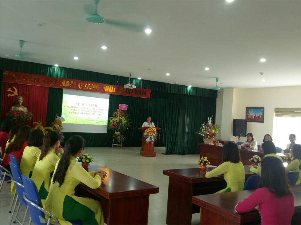 Trong buổi mít tinh đ/c Hồ Thị Tuyến - Bí thư chi bộ- Hiệu trưởng nhà trường lên đọc diễn văn chào mừng ngày nhà giáo Việt Nam ôn lại những kỉ niệm về ngày nhà giáo Việt Nam với lòng biết ơn sâu sắc tới những thế hệ nhà giáo đi trước đồng thời khích lệ tinh thần với các thế hệ nhà giáo đang trên con đường ươm dậy những mầm non tương lai của đất nước.