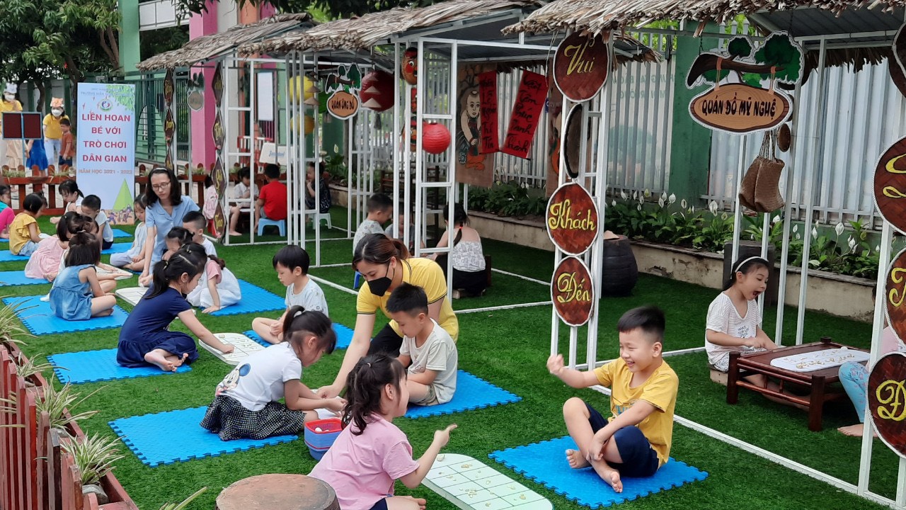 Như chúng ta đã biết, hoạt động vui chơi góp phần rất quan trọng trong quá trình hình thành và phát triển toàn diện cho trẻ mầm non. Hôm nay, sáng ngày 28/4/2022, Trường mầm non Tràng An tổ chức buổi liên hoan " Bé với trò chơi dân gian " cho các bé. Qua đó, trẻ hiểu được về các trò chơi dân gian như: Ô ăn quan, mèo đuổi chuột, cắp cua bỏ giỏ, rồng rắn lên mây........các trò chơi gắn liền với cuộc sống của người dân, những trò chơi đơn giản, dễ chơi với những bài đồng dao âm điệu nhịp nhàng hoà quyện với những trò chơi, tạo nhịp điệu, làm cho trò chơi trở lên sống động, vui tươi, nhí nhảnh. Trò chơi dân gian không những giúp trẻ phát triển tư duy mà còn là phương tiện làm phong phú đời sống tinh thần của trẻ, đáp ứng nhu cầu giao tiếp giữa trẻ và mọi người xung quanh.
