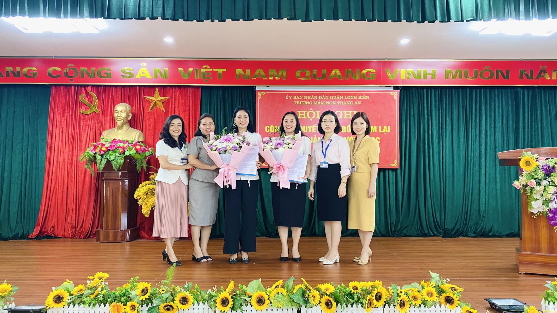 - Đại diện cho lãnh đạo Quận đ.c Nguyễn Thị Thu Hằng - Trưởng phòng nội vụ công bố, trao quyết định tặng hoa chúc mừng cho 02 đồng chí Trương Thị Bích Ngọc, Nguyễn Thị Hương được bổ nhiệm lại chức danh Phó hiệu trưởng trường mầm non Tràng An nhiệm kỳ 5 năm kể từ ngày 30/8/2023