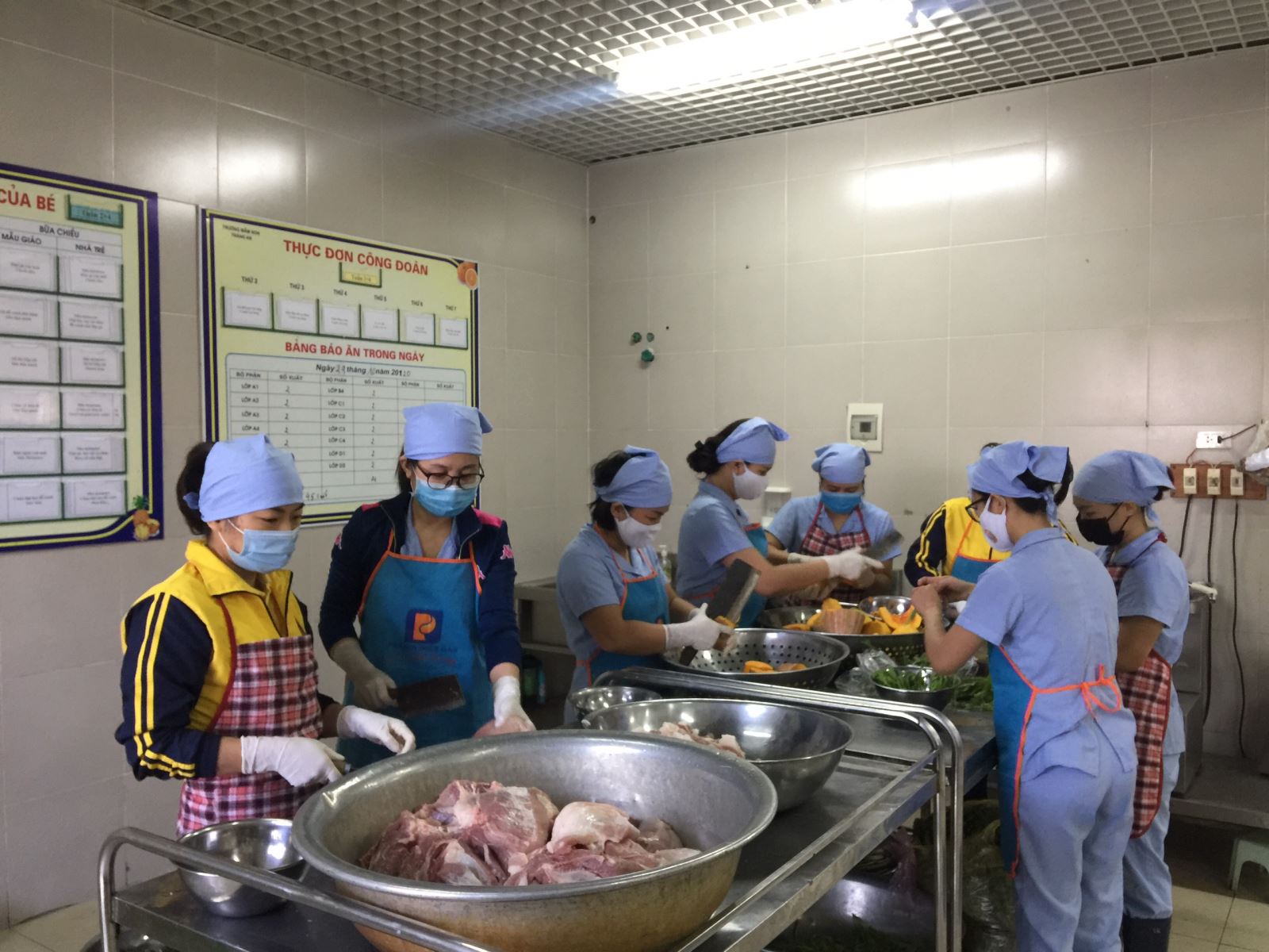 Ngay từ đầu giờ buổi sáng các thành phần BGH, Nhân viên nấu chính,nhân viên kế kế toán, Giáo viên, Thanh tra nhân dân, Thủ kho, nhân viên y tế, đại diện công ty minh thoa, và sự có mặt của Bà Phạm Thanh Bình - Đại diện Ban Phụ huynh của trường đã có mặt để tham gia khâu giao nhận thực phẩm.