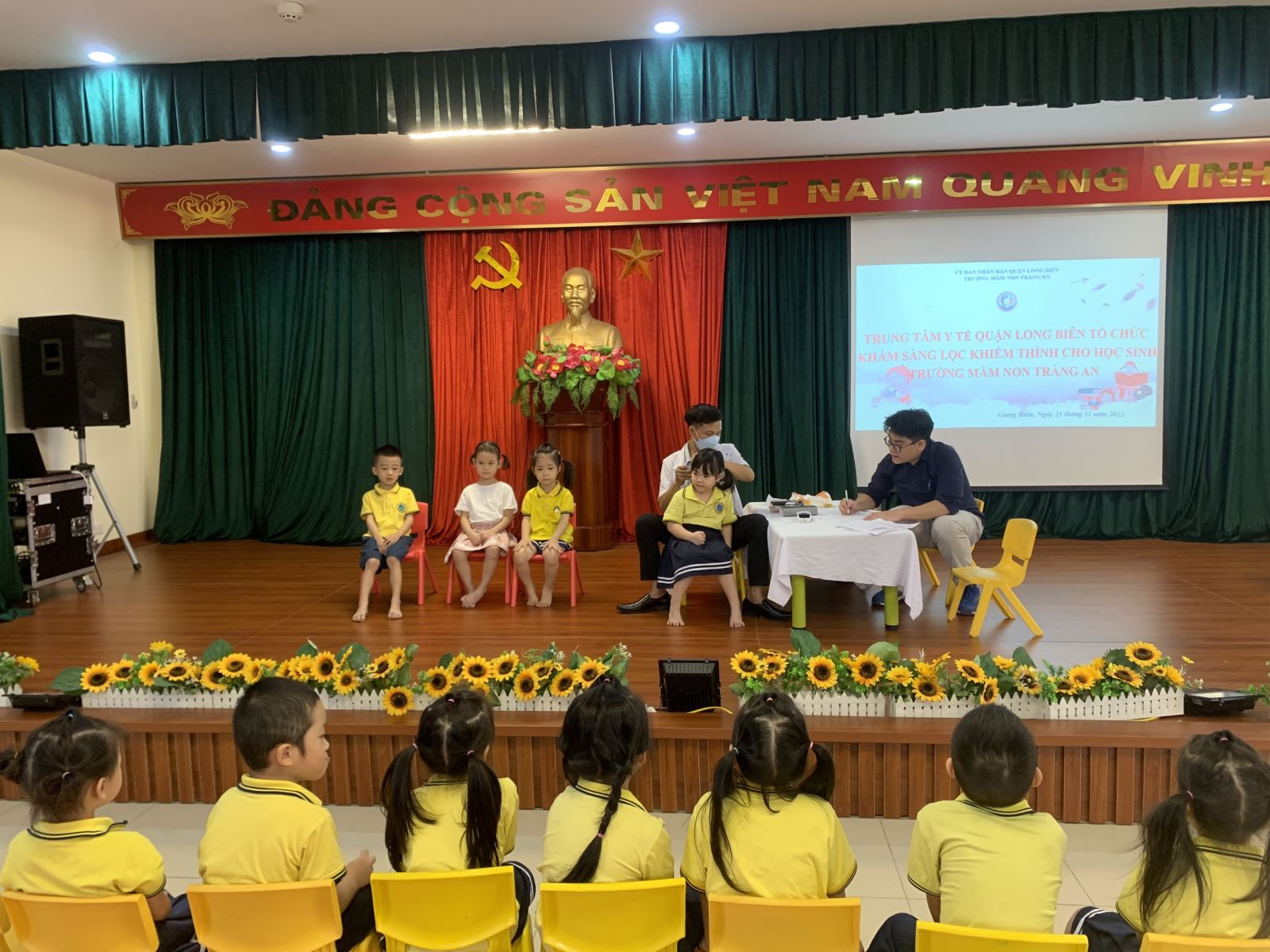 Mất thính lực hay còn gọi là điếc ở trẻ là mất khả năng nghe một hoặc cả 2 tai từ mức độ nhẹ đến mức độ điếc sâu. Mất thính lực gây ảnh hưởng nghiêm trọng đến khả năng giao tiếp cả bằng lời và ngôn ngữ, cử chỉ ở trẻ. Gia tăng các rối loạn hành vi và gặp nhiều khó khăn trong giáo dục trẻ. Trẻ bị mất thính lực sẽ trở thành gánh nặng cho gia đình và xã hội. Nhận thức được tầm quan trọng của vấn đề này, trường MN Tràng An đã phối hợp với trung tâm y tế Quận Long Biên khám sàng lọc khiếm thính cho trẻ và tuyên truyền tới phụ huynh.