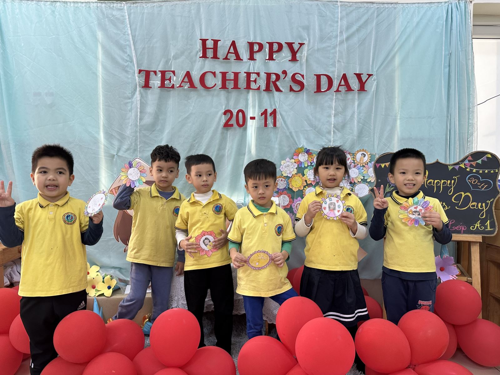 Bằng những nguyên liệu đơn giản sẵn có như: giấy bìa trắng, màu sáp, kéo, giấy gói hoa, dây ruy băng… Các bạn nhỏ lớp A1 đã “thiết kế” những bông hoa “siêu đặc biệt” dành tặng 2 cô giáo của mình nhân ngày 20/11.