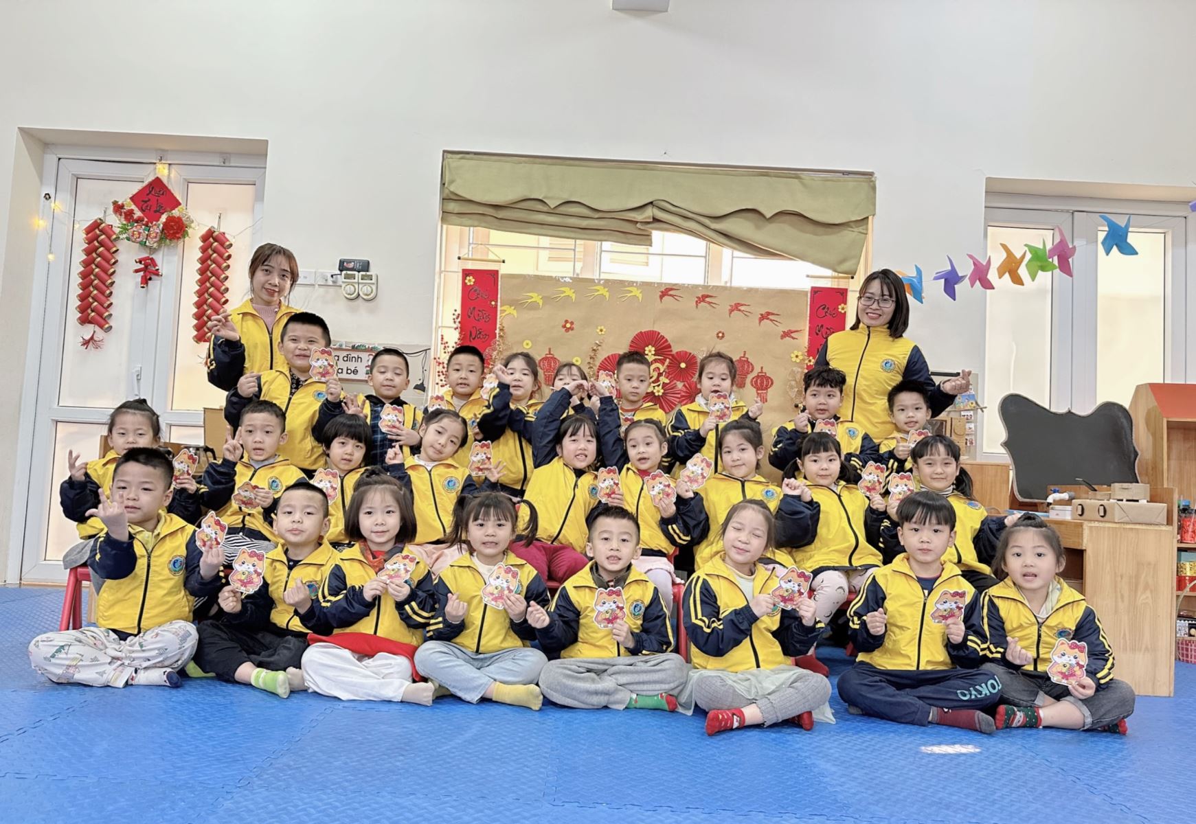 Các con cùng nhau trang trí, làm những tràng pháo rực màu sắc đỏ tươi, cùng với những tấm lì xì điểm tô cành đào, cành mai làm cho không gian lớp trở nên gần gũi, ấm áp và tươi sáng hơn. Ngoài ra, các con còn cùng nhau làm những cánh quạt đề trang trí câu đối và background để check in đón Tết thêm phần đẹp hơn ở lớp mình. Một tuần nghỉ tết đã qua, cô và trò gặp mặt đầu xuân đầy phấn khởi. Các con được nhận những bao lì xì may mắn từ các cô. Chúc các bé A1 thêm 1 tuổi luôn khỏe mạnh, chăm ngoan, học giỏi.