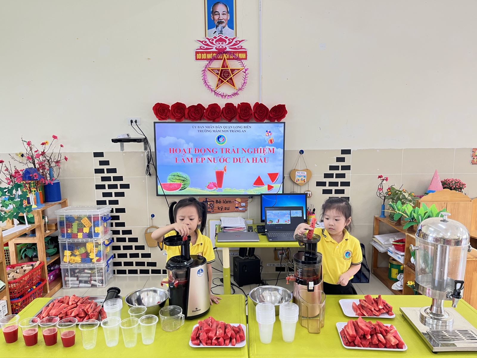 Hôm nay, các bạn nhỏ lớp Mẫu giáo lớn A2 Trường mầm non Tràng An đã cùng nhau tham gia hoạt động trải nghiệm “Làm nước ép dưa hấu”. Dưa hấu có cách chế biến khá đơn giản. Dưới sự chuẩn bị chu đáo và cách hướng dẫn của cô giáo, các bé đã tự tay làm cho mình những cốc nước ép vô cùng bổ dưỡng. Đầu tiên, các bạn nhỏ được nhận biết các nguyên liệu, dụng cụ để thực hành món nước ép. Tiếp đó là cho từng miếng dưa hấu vào máy ép và bấm nút… máy ép xoay đều… Cuối cùng, còn gì tuyệt vời hơn là thưởng thức thành quả của mình… Các bé vừa trò chuyện vừa cùng nhau uống một cách ngon lành và thích thú.
