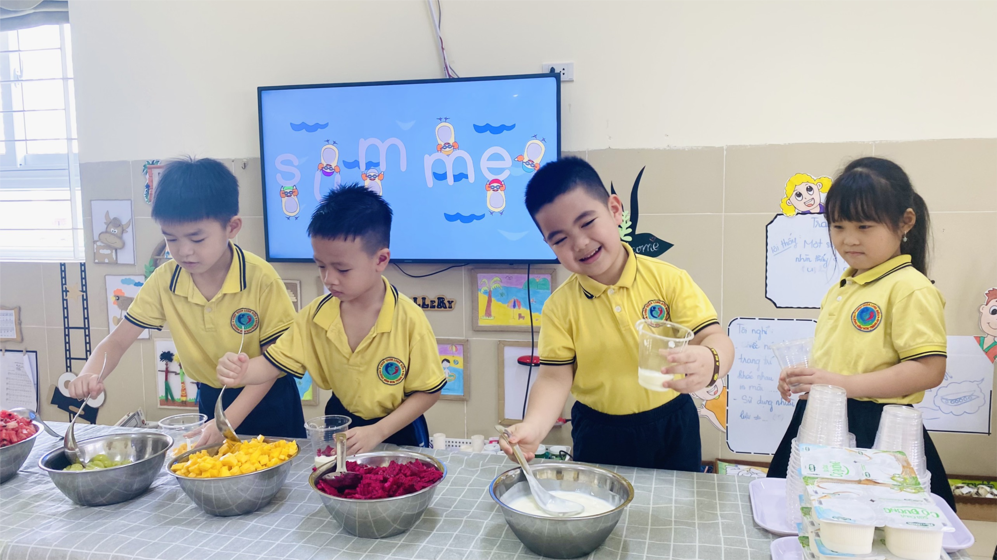 Hoa quả chính là nguồn cung cấp Vitamin tự nhiên dồi dào nhất, vậy nhưng hầu hết các bé đều khá lười ăn hoa quả. Biết được điều đó, hôm nay cô và trò lớp A1 đã cùng nhau tham gia vào hoạt động trải nghiệm "Bé làm sữa chua hoa quả”. Qua hoạt động này nhằm hình thành kỹ năng sống cho trẻ, giáo dục cho trẻ có hành vi văn minh trong ăn uống, rèn luyện kỹ năng tự phục vụ. Trong hoạt động này các bé và cô giáo trò chuyện về các nội dung giáo dục dinh dưỡng và sức khỏe, biết được ý nghĩa và tầm quan trọng của các bữa ăn trong ngày. Biết được các loại thực phẩm và giá trị dinh dưỡng cần thiết cho sự phát triển của cơ thể.