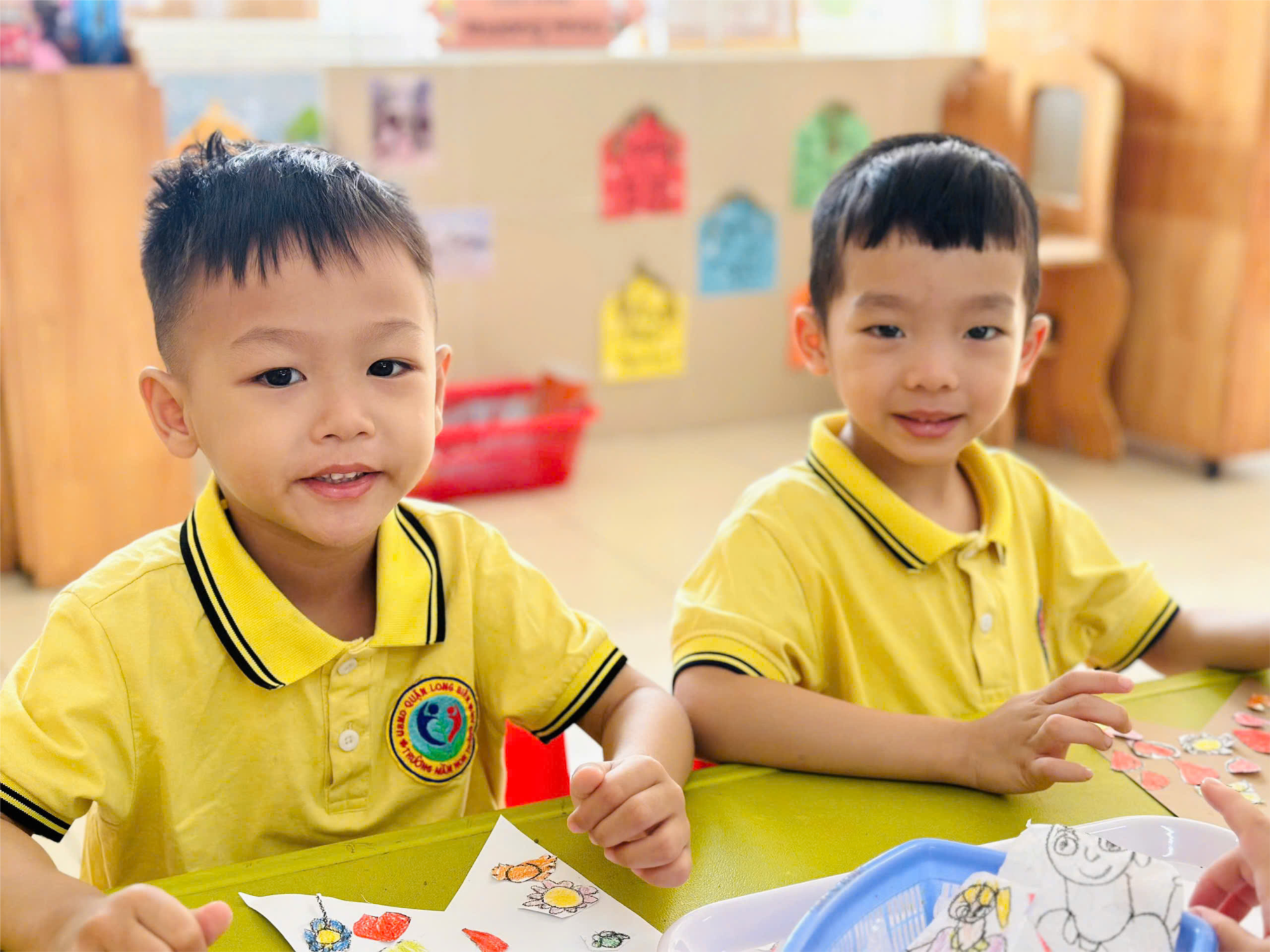 Với mong muốn dành tặng cho cô giáo một món quà ý nho nhỏ, các bạn lớp A2 đã cùng nhau làm cờ đuôi nheo để trang trí lớp. Các con tự tay vẽ những bông hoa, trái tim, chân dung cô giáo và cắt dán lên trên cờ treo ở lớp.