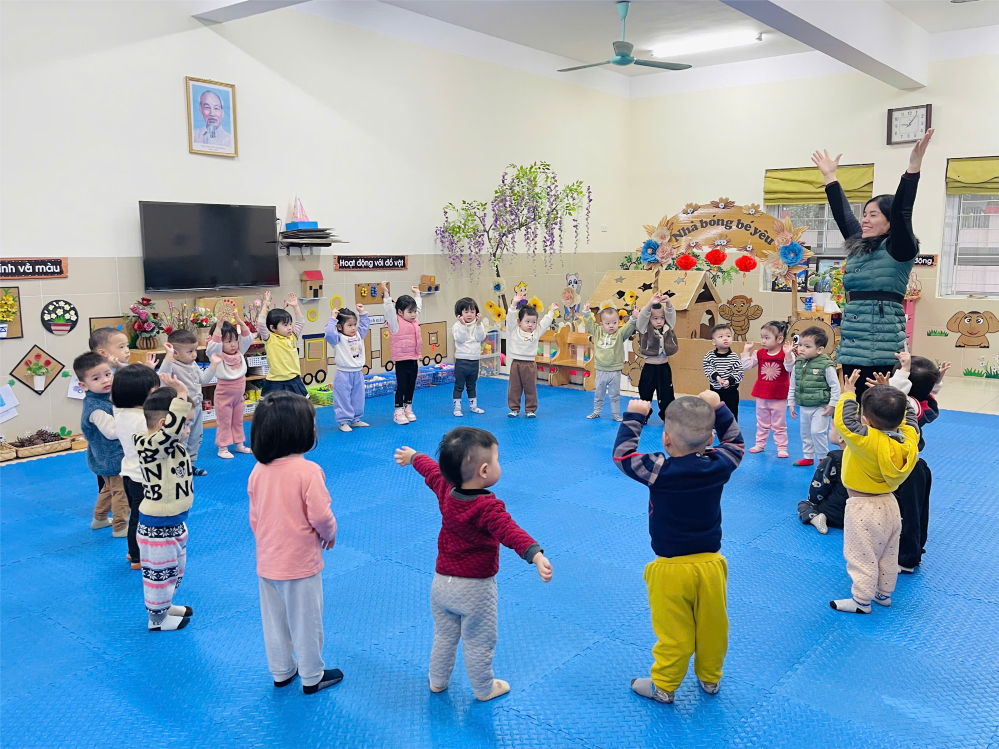Các bé lớp nhà trẻ D1 với bài học vận động thể chất : " Ném bóng về phía trước". Bài học không chỉ giúp chúng con nâng cao sức khỏe mà còn giúp chúng con phát triển trí tuệ một cách toàn diện, nâng cao tính kỷ luật, sự tập trung, tinh thần đoàn kết, tính trung thực và rèn luyện sự tập trung… Việc vận động sẽ rất có ích đến hệ thần kinh, hỗ trợ định hình và phát triển tâm lý của mỗi bạn nhỏ.