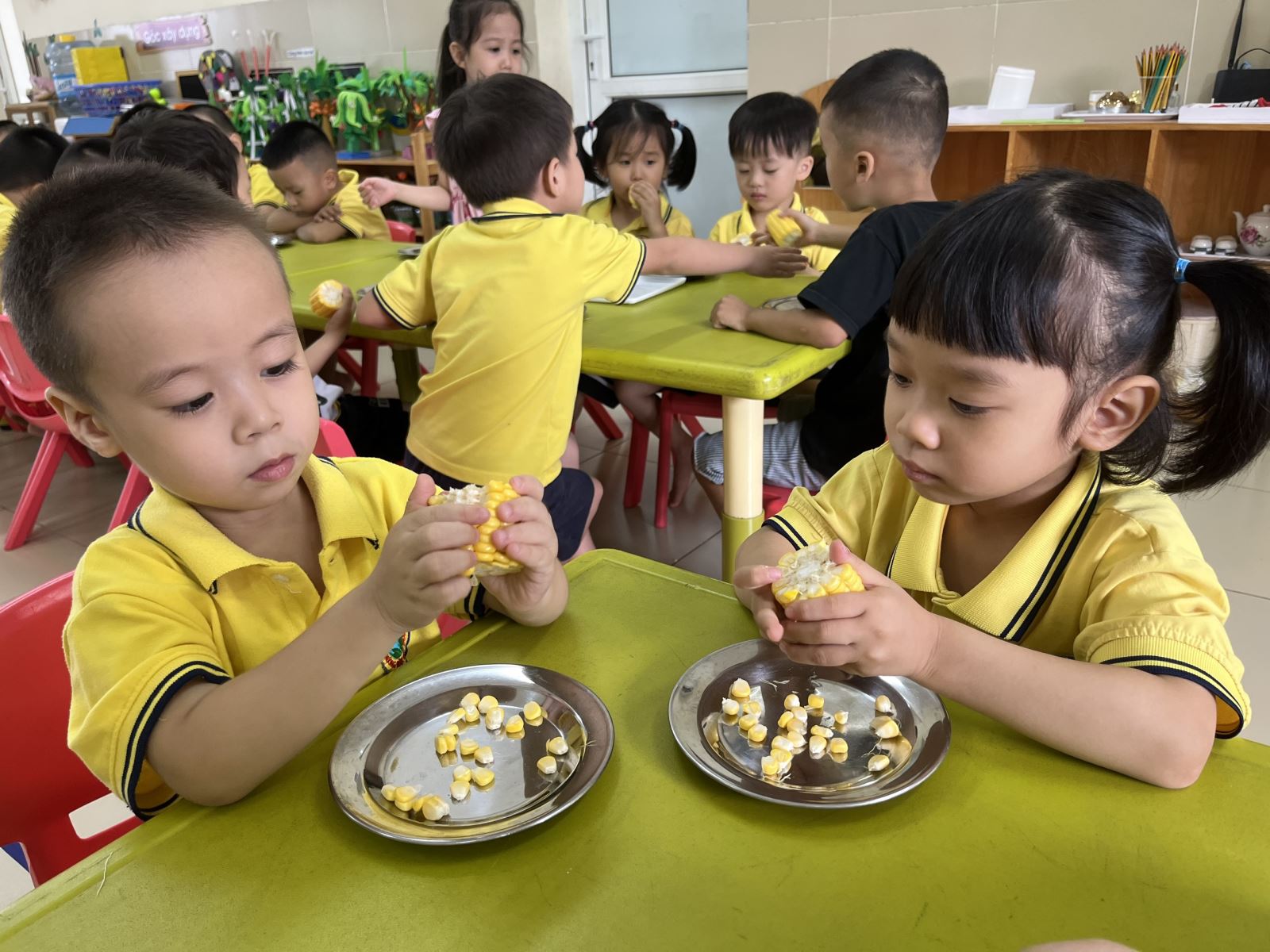 Đầu tiên các bạn sẽ tách hạt ra khỏi lõi ngô, những việc đơn giản nhưng lại kích thích sự hứng thú ở trẻ. Những bắp ngô được các cô chuẩn bị và sắp xếp đẹp mắt giúp cho trẻ thích thú hơn. Thông qua hoạt động bóc, tách giúp trẻ có kĩ năng vận động tinh, tính kiên nhẫn, tỉ mỉ và nhiều kĩ năng sống khác ở trẻ. Tiếp theo cô sẽ hỗ trợ giúp các bé xay hạt ngô để ra sản phẩm là sữa ngô thơm ngon, béo ngậy.