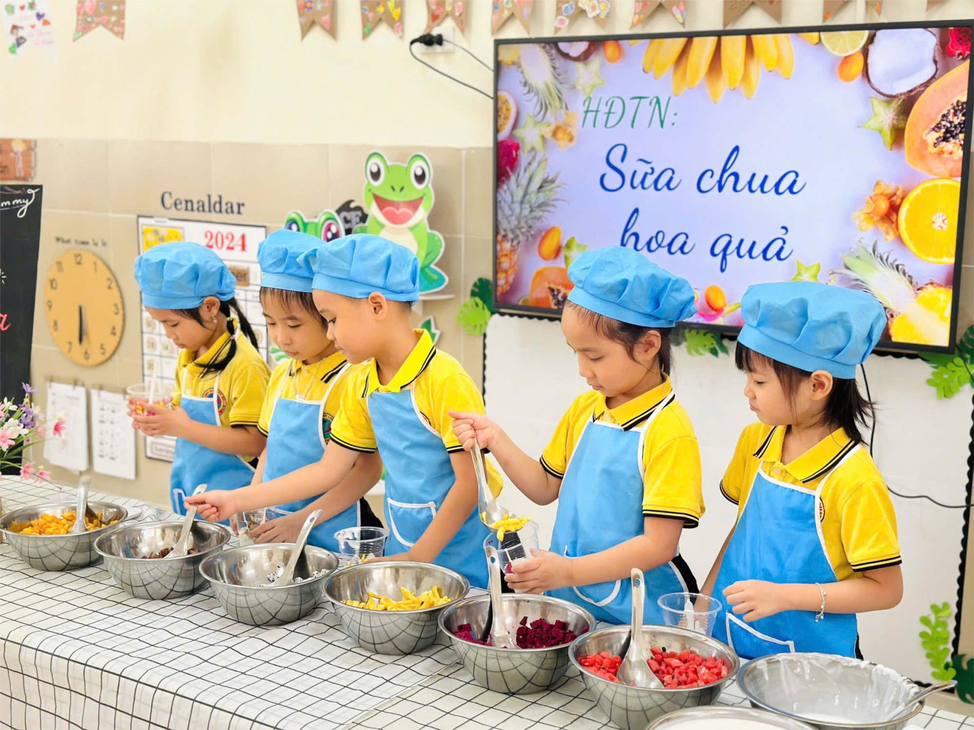 Nhận biết các nguyên liệu như dưa hấu, xoài, thanh long, mít, nho, sữa chua,... để làm món hoa quả dầm, chính là công đoạn đầu tiên khi bắt tay vào làm của “các đầu bếp nhí A2". Các bé dùng muỗng múc sữa chua và lần lượt xúc các nguyên liệu (đã được cô giáo cắt nhỏ sẵn) cho vào từng cốc, thế là đã có 1 cốc hoa quả dầm sữa chua vừa ngon lành vừa bổ dưỡng.