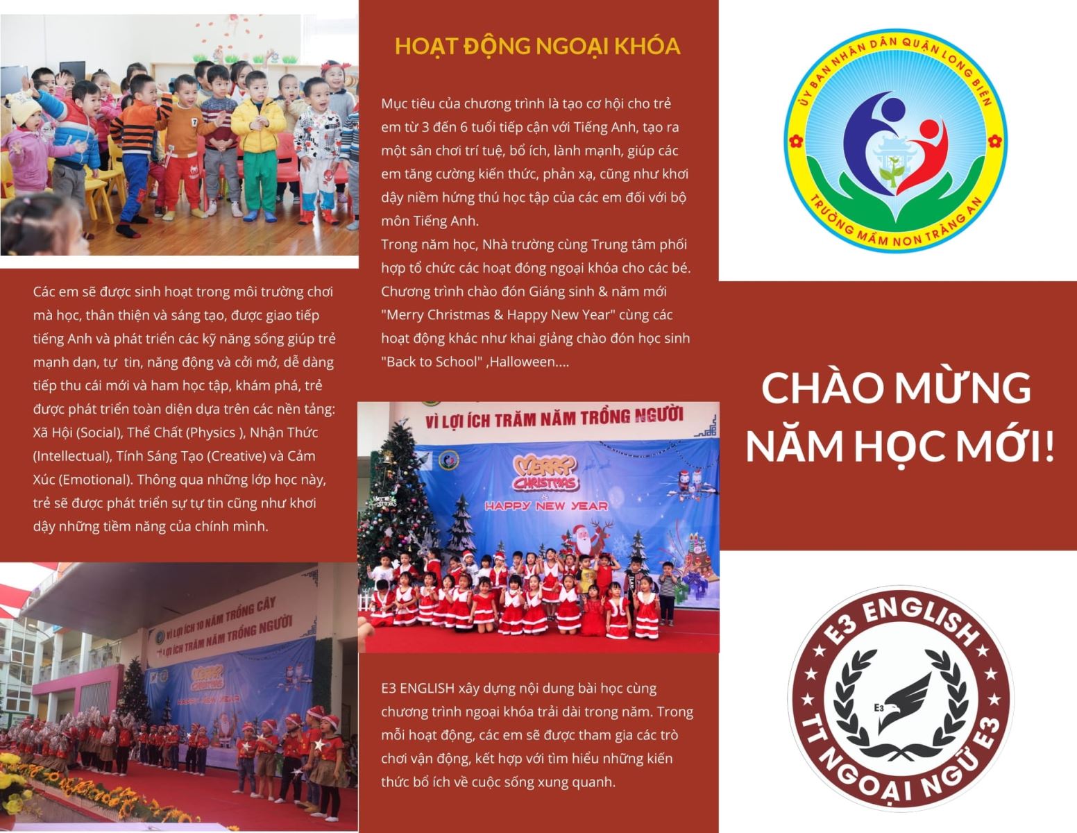 Nhận thấy tầm quan trong của việc cho trẻ mầm non làm quen tiếng Anh và nhu cấu của các bậc phụ huynh về vấn đề này. Ngay từ khi thành lập trường, ban giám hiệu nhà trường đã tìm hiểu về chương trình liên kết “Cho trẻ làm quen tiếng Anh” của Trung tâm E3, đồng thời xin ý kiến chỉ đạo về chuyên môn của PGD&ĐT và Sở GD Hà Nội về bộ giáo trình “Happy Hearts”.