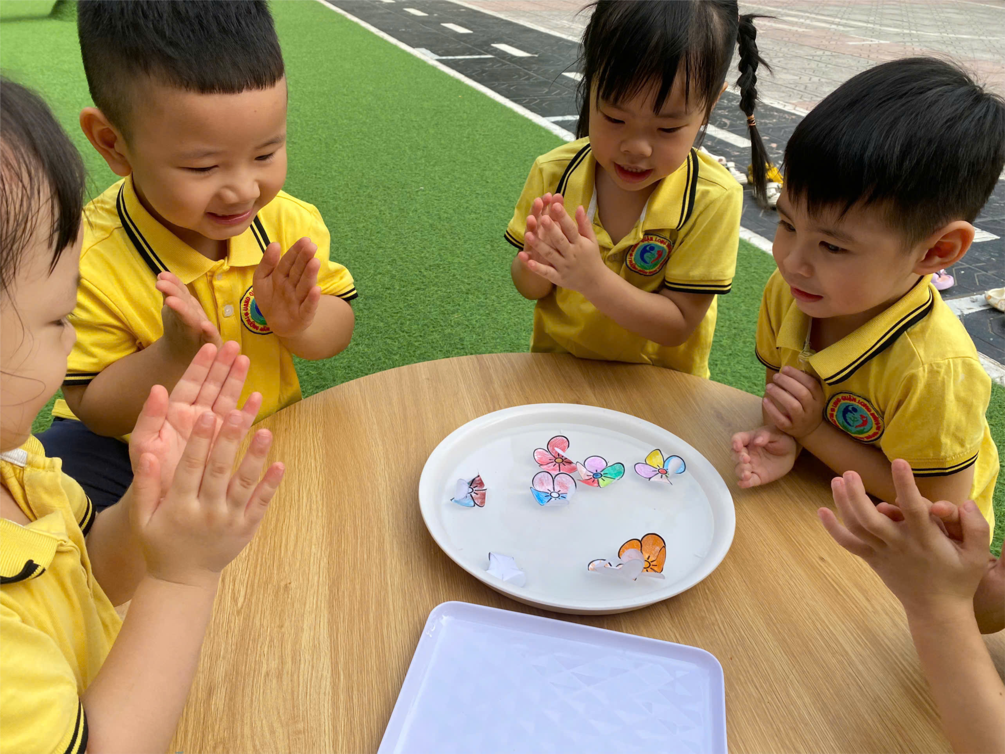 Hôm nay các bé lớp MGBC2 được tham gia thí nghiệm " Hoa nở trong nước".Nghe tên bài học thôi đã khiến các bé tò mò rồi! Những thí nghiệm tưởng chừng như đơn giản, dễ làm này lại gây được nhiều hứng thú cho các bé đến vậy! Các bạn có muốn tham gia học cùng lớp C2 chúng tớ không? Để thực hiện được thí nghiệm này các cô đã cho chúng tớ tô màu bông hoa thật đẹp và hướng dẫn chúng tớ cách gấp từng cánh hoa lại. Chúng tớ sẽ cùng nhau thả hoa vào nước và chờ đợi xem điều gì sẽ xảy ra? Chúng tớ cứ thắc mắc là tại sao hoa giấy lại nở được ở trong nước nhỉ? Chỉ có hoa thật trồng trong đất thì mới nở hoa chứ nhỉ? Ngay bây giờ xin mời các bạn cùng ngắm nhìn những hình ảnh đáng yêu trong buổi học sáng nay của lớp C2 chúng tớ nhé!