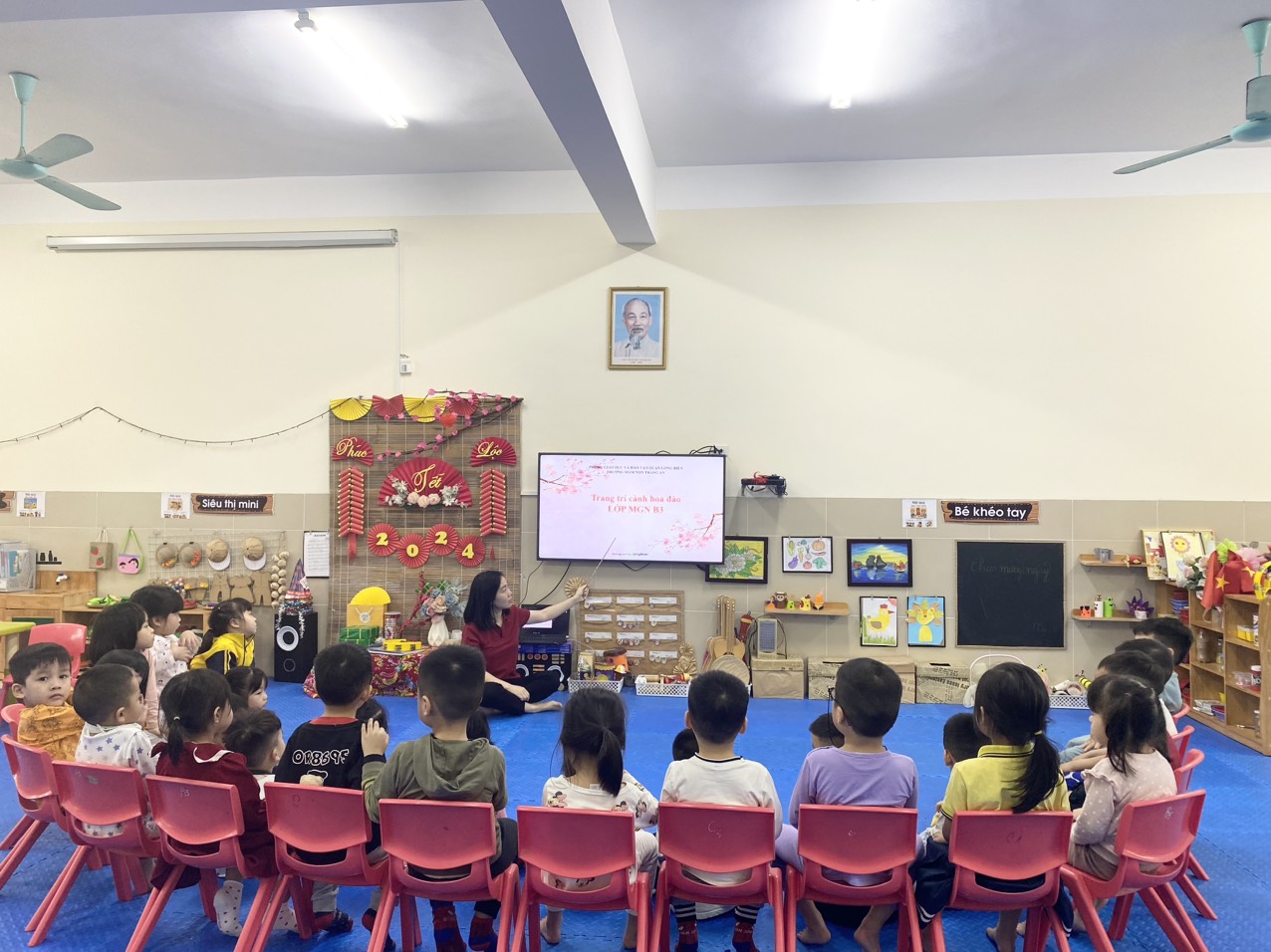 Mùa xuân đến.Những cành đào khoe sắc khắp nơi nơi.Hòa chung không khí đón xuân về, các bạn lớp MGNB3 cùng nhau trang trí cành đào đấy!
