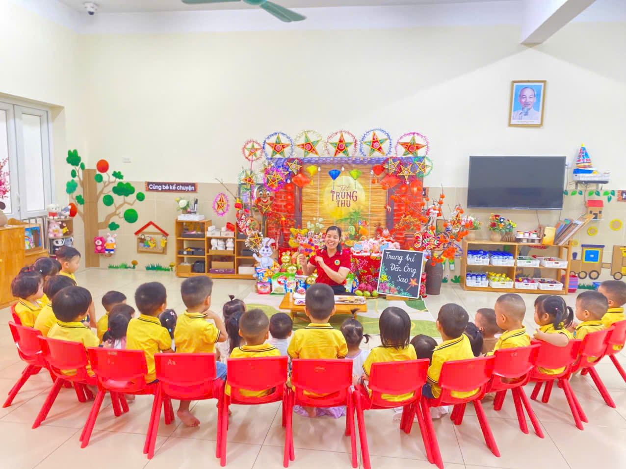 Để không khí Trung Thu thêm rộn ràng, các bé đã tự tay làm trang trí nên những chiếc đèn ông sao nhỏ xinh. Hoạt động "Trang trí đèn ông sao" là một hoạt động giáo dục ý nghĩa giúp trẻ nhỏ nhận biết và hiểu hơn về Tết Trung Thu. Qua đó phát triển kỹ năng vận động tinh, khả năng sáng tạo màu sắc và sự phối hợp tay-mắt. Niềm háo hức, sự hứng thú thể hiện rõ trên khuôn mặt khi các bé tham gia hoạt động cùng cô và các bạn.