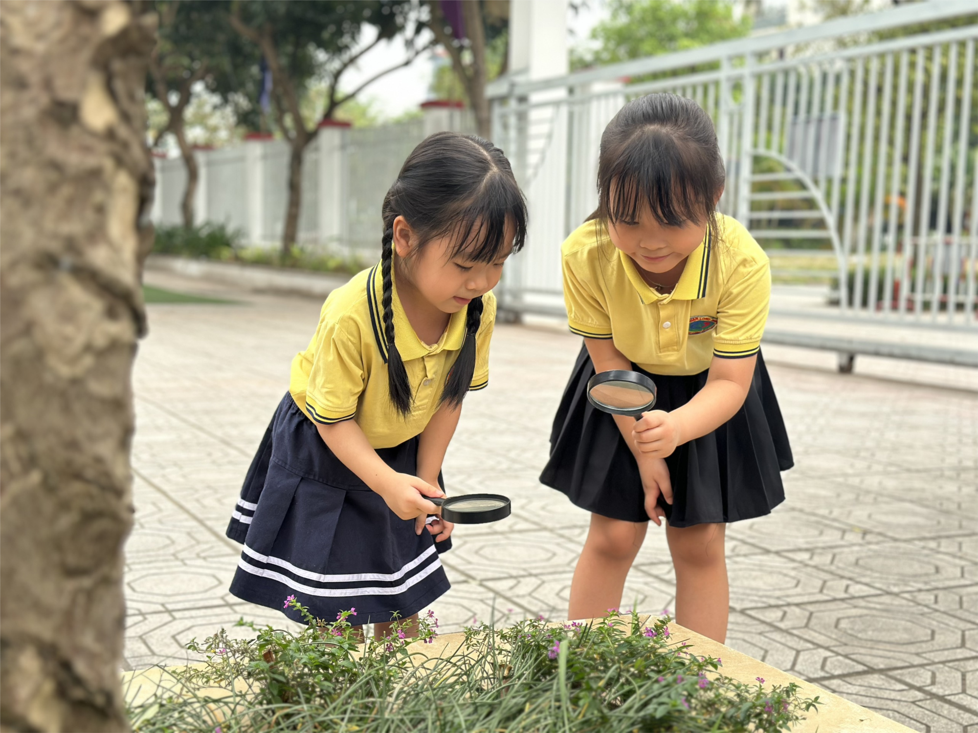 Trong sân trường rộng rãi, với ánh nắng vàng rực rỡ của sớm mai, cô trò lớp MGL A1 đã cùng nhau tham gia hoạt động ngoài trời “Tìm hiểu về lá cây bằng kính lúp”