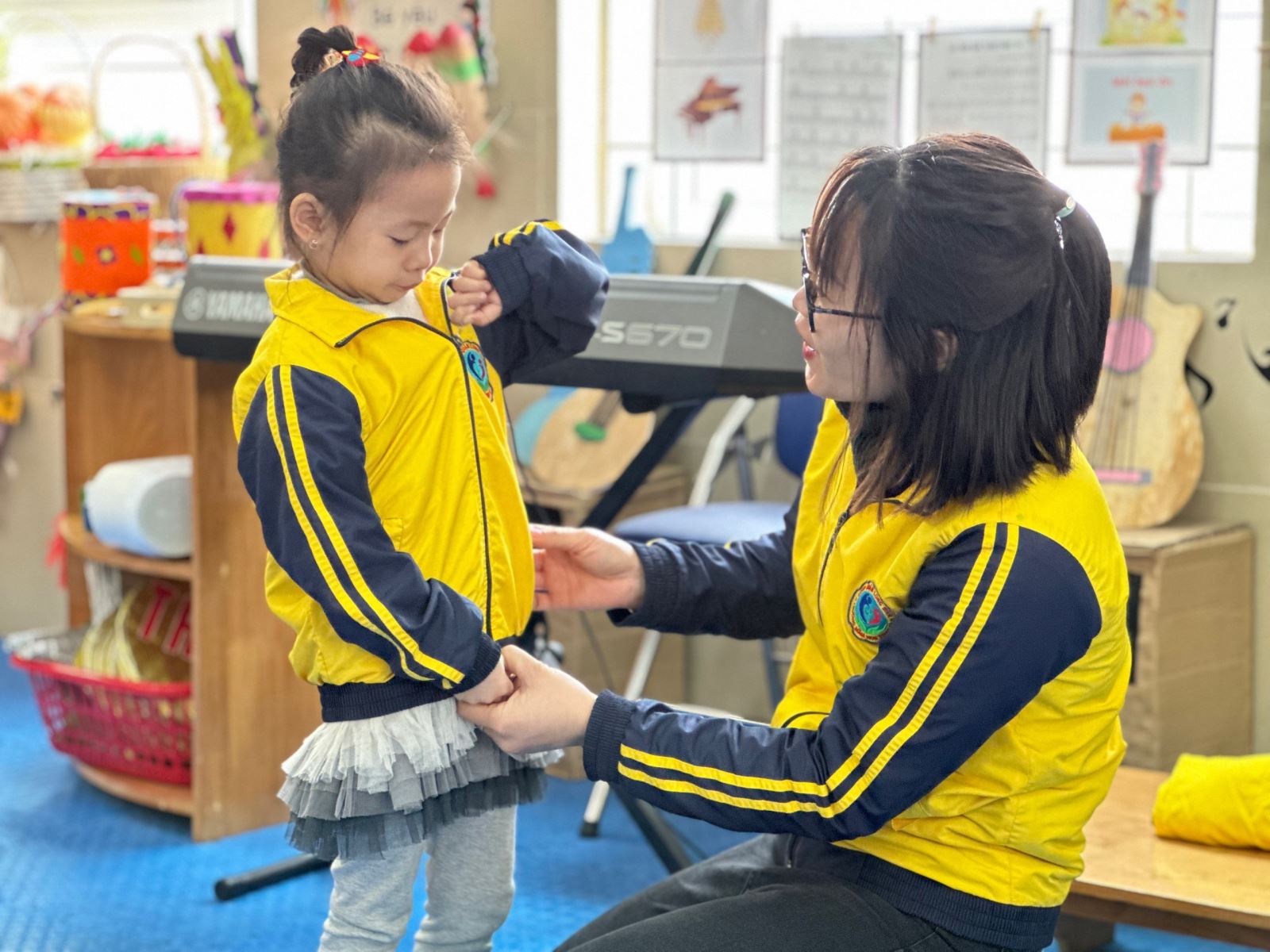Có thể thấy, việc giáo dục cho trẻ kỹ năng tự phục vụ là một trong những nội dung giáo dục kỹ năng sống cho trẻ mầm non. Ở lứa tuổi này, trẻ cần phải được trang bị đầy đủ những kỹ năng cơ bản để biết tự phục vụ bản thân. Ở lớp MGL A1, cô giáo đã hướng dẫn trẻ cách cài và kéo khóa áo để trẻ có kỹ năng và không phải nhờ người lớn giúp. Qua hoạt động giúp các con tự tin, kiên trì, khéo léo khi kéo khóa áo khoác. Trước khi kéo khóa áo khoác, các con sẽ mặc áo và dùng tay chỉnh cổ áo do nhiều trẻ mặc rất hay bị gập 1 bên cổ áo vào trong. Các con biết cầm 2 tà áo bằng nhau, kéo củ khóa xuống phía dưới, Tay trái cầm giữ củ khóa, tay phải cài phần khóa bên tà áo còn lại vào rãnh của cú khóa sau đó tay trái giữ chặt, tay phải kéo củ khóa lên. Trong quá trình làm, trẻ phải thật khéo léo, quan sát và làm cẩn thận. Đến gần cổ áo, trẻ có thể kéo nhẹ nhàng thẳng lên hết hoặc muốn bẻ cổ áo thì trẻ chỉ kéo gần đến phần cổ áo sau đó dùng 2 tay bẻ cố áo gọn gàng.