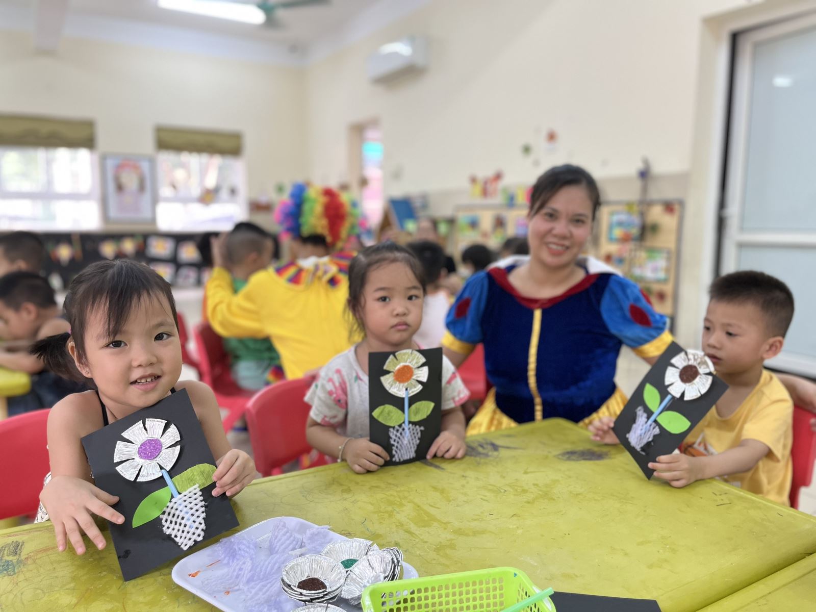 Cùng đến với buổi học tuần này của các bạn Trường Mn Tràng An nhé. Từ những nguyên vật liệu dễ kiếm, dễ tìm trong cuộc sống như “cốc giấy bac, ống hút, xốp bọc hoa quả..” nàng bạch tuyết đã hướng dẫn các bạn nhỏ với đôi bàn tay khéo léo tạo thành một bức tranh bông hoa rất là đẹp. Không chỉ có vậy mà còn giáo dục trẻ biết tái sủ dụng các đồ dùng đã qua sử dụng như các đồ dùng bằng nhưa ko thể tái chế để tạo thành các sản phẩm khác có ý nghĩa, giúp bảo vệ môi trường. Các bé đều rất vui khi đã có những bông hoa rất đẹp để về tặng cho bà, cho mẹ của mình.