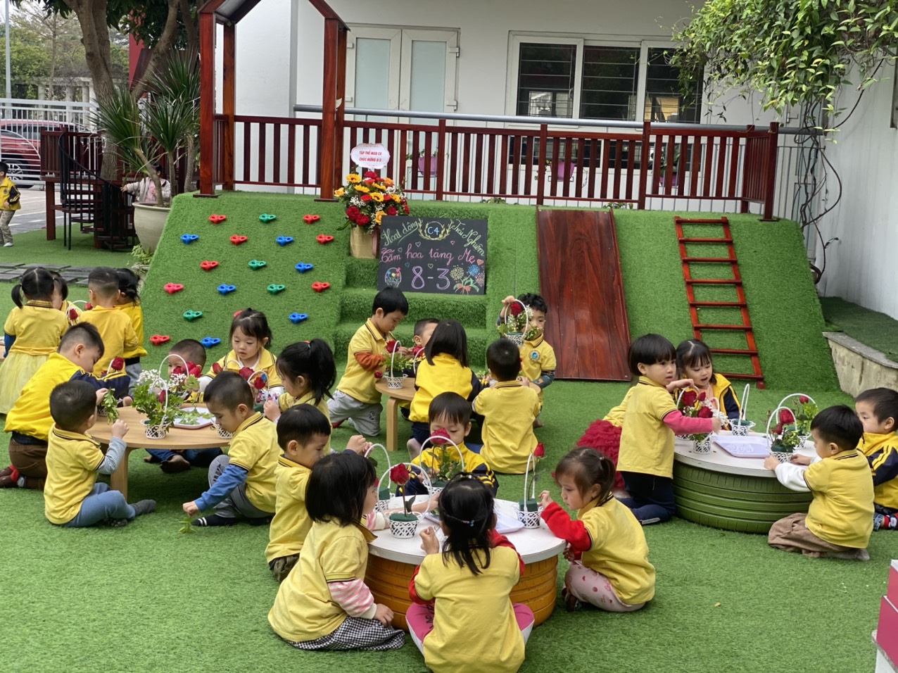 Trong tiết trời se lạnh cùng với những làn gió thổi nhẹ. Sáng ngày hôm nay Các bạn lớp C4 rất hứng thú cùng Cô giáo cắm những lẵng hoa nhỏ xinh xinh để chúc mừng ngày 8/3. Biết bao điều muốn nói với Bà ,mẹ, cô giáo .Những lẵng hoa nói giúp các bé rất nhiều: Chúng con yêu Bà ,mẹ ,các cô giáo nhiều lắm. Nào chúng ta cùng các bạn lớp C4 chúc mừng ngày Quốc tế phụ nữ 8/3