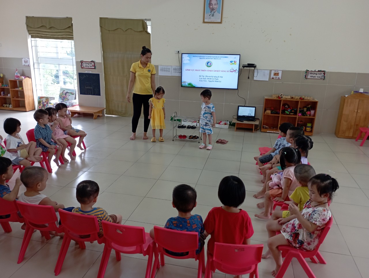 Các bé lớp mẫu giáo bé C4 được tham gia vào hoạt động " Rèn trẻ kỹ năng đi dép đúng chiều và cất dép đúng nơi quy định " cùng sự hướng dẫn của cô giáo.