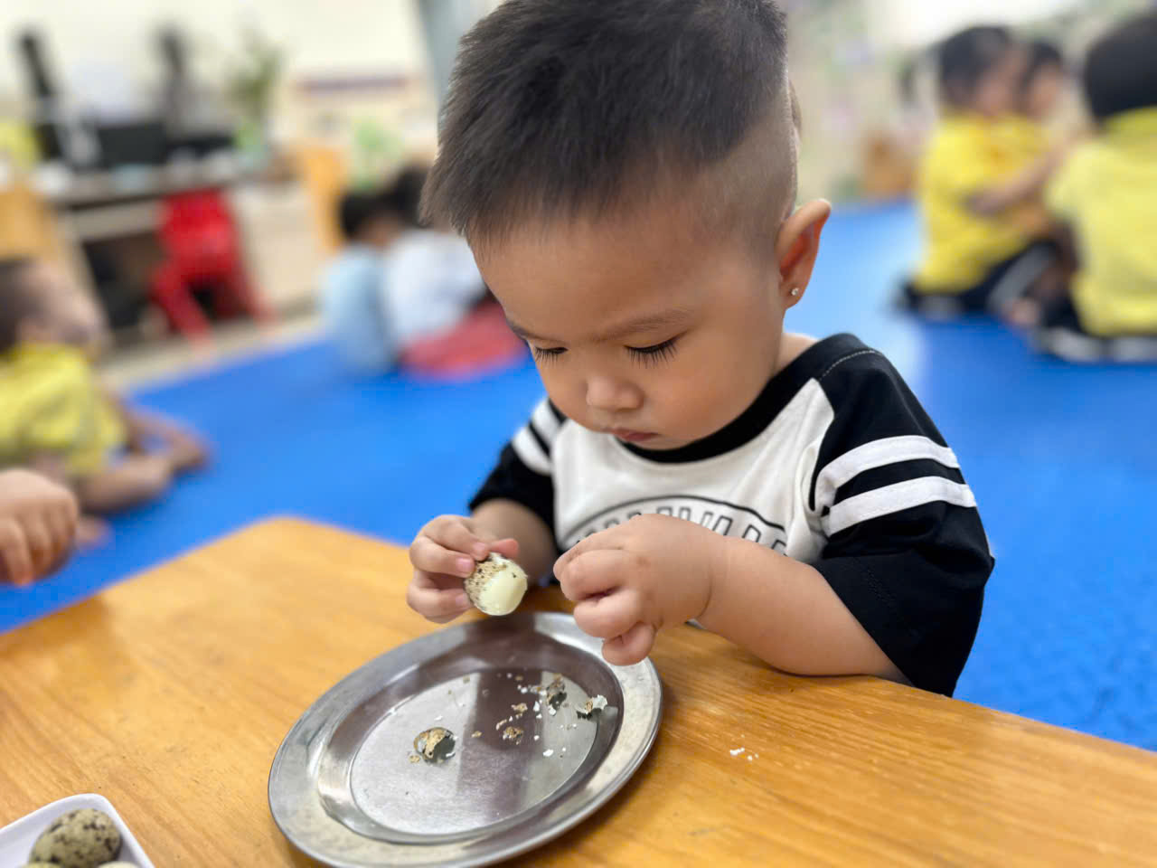 Với tiêu chí “Học mà chơi, chơi mà học - Học đi đôi với thực tiễn”. Hôm nay, các con lớp nhà trẻ D1 trường mầm non Tràng An được cô giáo tổ chức tham gia hoạt động trải nghiệm “ Bóc trứng cút”. Hoạt động “Bóc trứng cút” là một hoạt động thú vị của các bạn nhỏ, tuy đơn giản nhưng mang lại sự trải nghiệm vô cùng to lớn, nó giúp trẻ rèn luyện sự khéo léo của những ngón tay, sự tỉ mỉ, rèn luyện tính kiên trì cho trẻ. Thông qua hoạt động này, đã rèn cho các con sự khéo léo từ đôi bàn tay và đặc biệt các con có thể giúp bố mẹ trong việc nội trợ rồi đấy!
