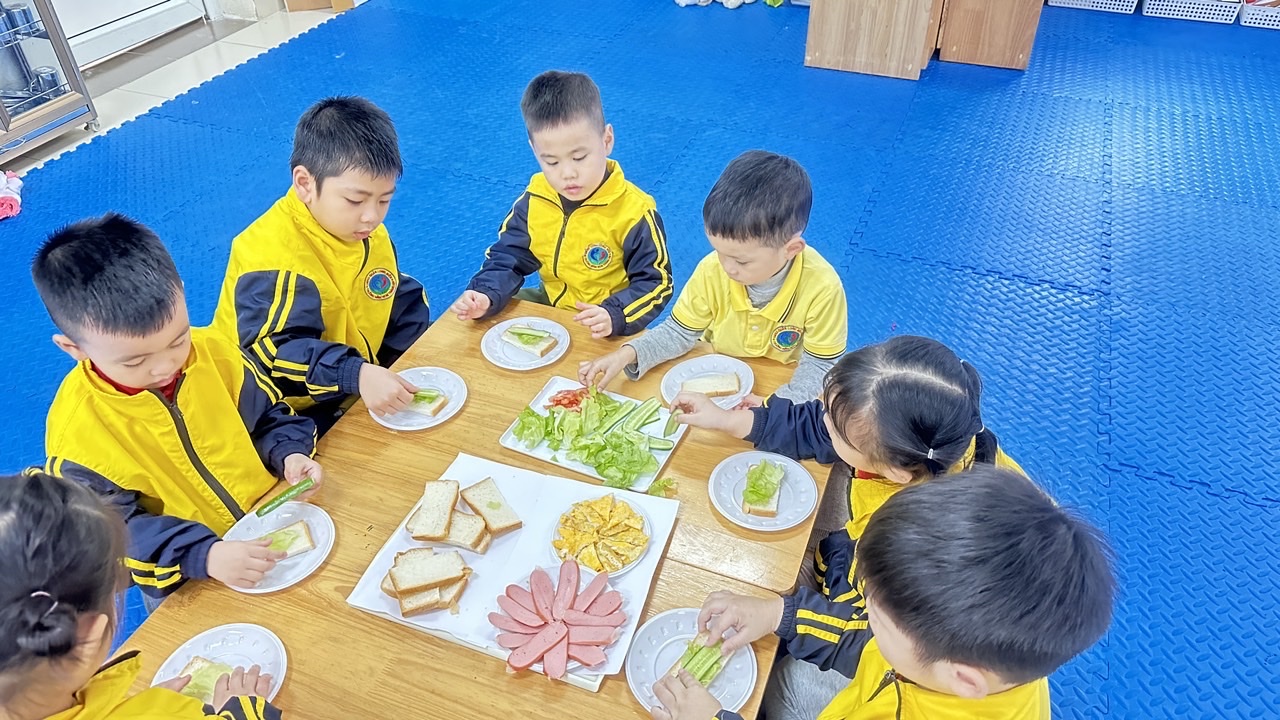 Với những nguyên liệu rất gần gũi với trẻ đã được các cô chuẩn bị sẵn như: Xúc xích, trứng chiên, rau xà lách..., các bé lớp mẫu giáo nhỡ B4 được tự tay làm những miếng bánh mì sandwich kẹp theo ý thích của mình. Những đôi mắt chăm chú, bàn tay khéo léo, xen lẫn sự vụng về và một tinh thần tự tin, cố gắng của mỗi bé, tất cả tạo nên một hoạt động thật hứng thú nhưng không kém phần hấp dẫn.
