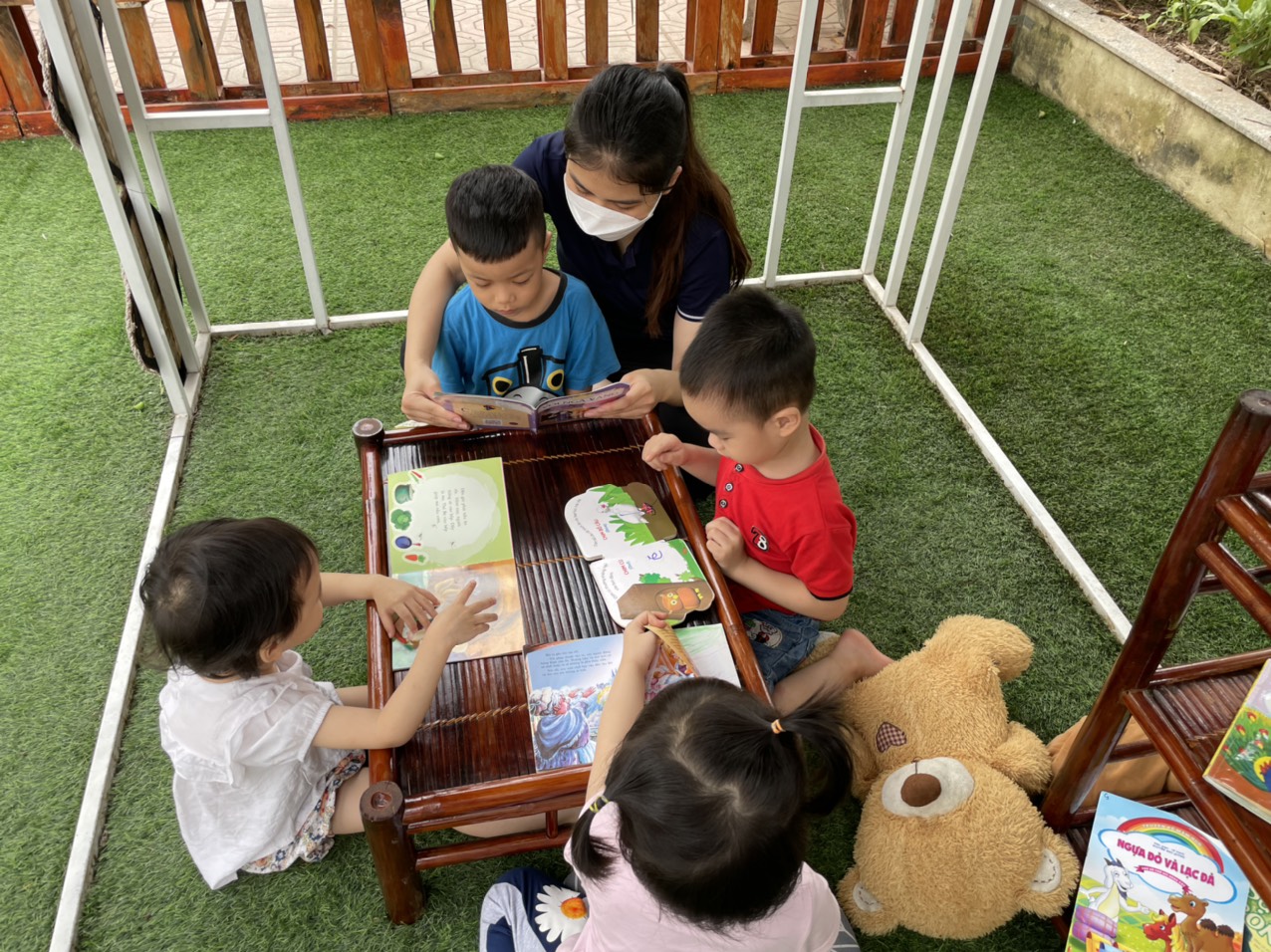 Buổi sáng ngày 26 tháng 4, các bạn lớp mẫu giáo bé C3 đã cùng các cô xuống góc đọc sách dưới sân trường. Ngoài được đọc những quyển sách hay, các con còn được giao lưu với các bạn, các anh chị các lớp trong trường, cùng trò chuyện và trao đổi những quyển sách mà mình yêu thích cho bạn bè