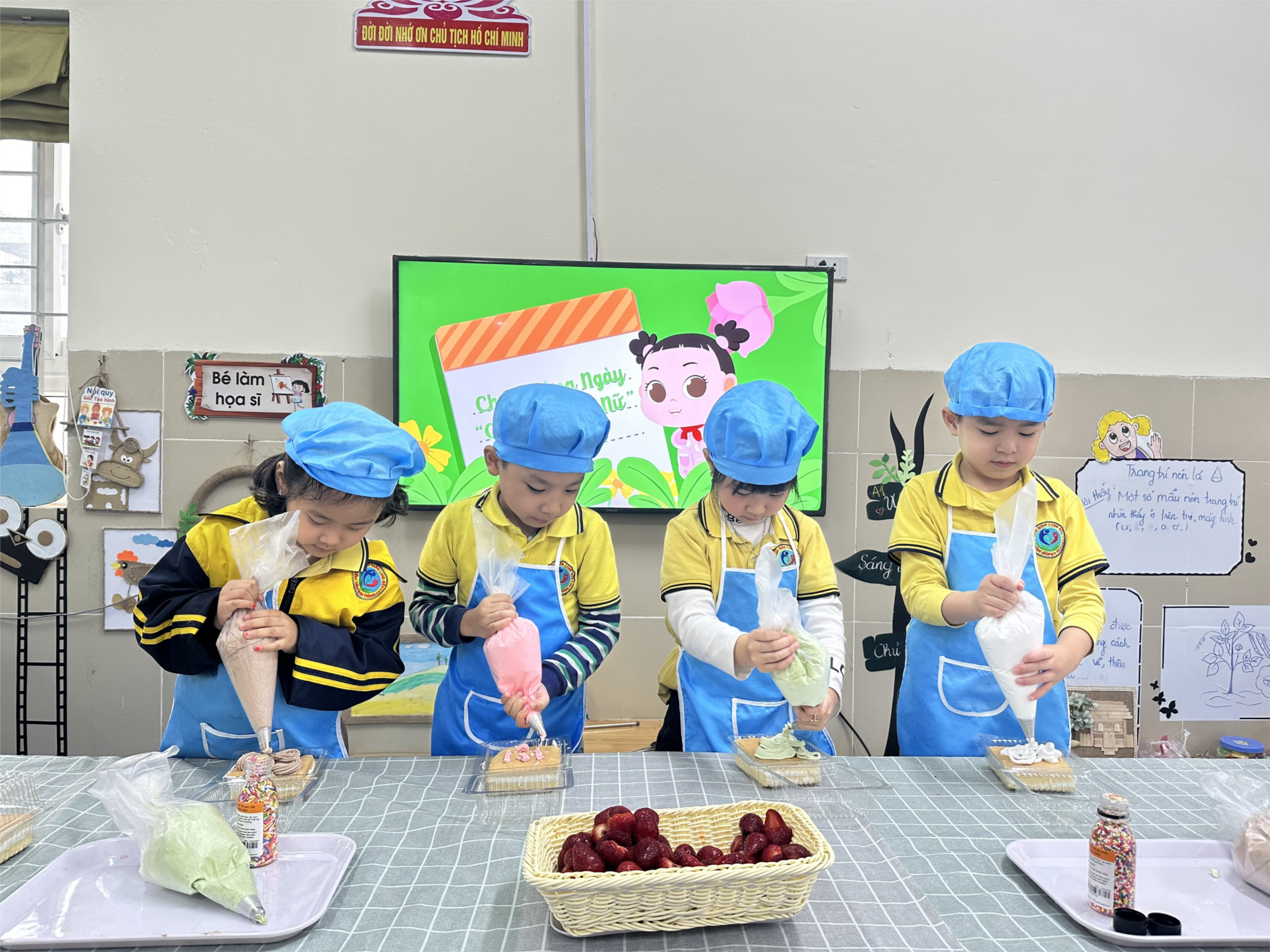 Tham gia buổi trải nghiệm, trẻ được thực hiện các thao tác như: Trẻ tự tay bóp kem đều khắp mặt bánh, trang trí bánh để tạo ra những chiếc bánh với các hình dáng bắt mắt, rồi trẻ tự tay đóng bánh vào hộp. Qua đó, đã rèn sự khéo léo, tính kiên trì và cẩn thận ở trẻ.