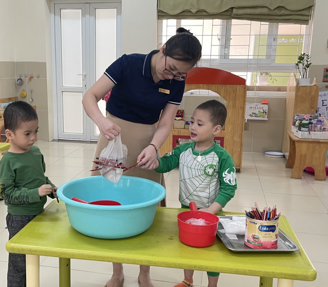 Hoạt động chiều của lớp MGN B4 hôm nay với thí nghiệm "Xuyên bút chì qua túi bóng nước".