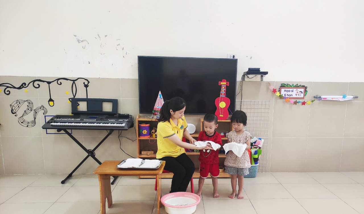 Qua hoạt động này trẻ được củng cố thêm kỹ năng cũng như các thao tác như : cách cầm khăn , lau từng phần trên khuôn mặt của trẻ ( trán ,mắt ,mũi ,miệng ,cằm và cổ...)