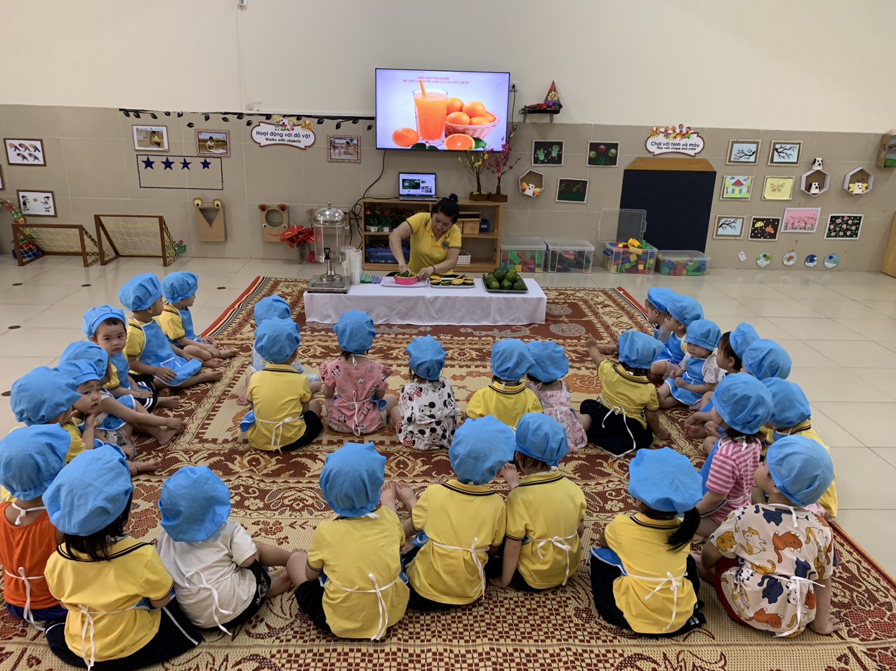 Hôm nay cô và trò cùng tham gia hoạt động vắt nước cam. Qua hoạt động "vắt nước cam" này khiến các bé rất thích thú vì các bé được thưởng thức cốc nước cam ngon, ngọt do chính mình tự tay pha làm. Các bé còn hiểu được muốn cơ thể khoẻ mạnh và lớn lên cần phải ăn uống đủ chất và cần uống bổ sung các loại nước hoa quả chứa nhiều vitamin. Đặc biệt nước cam có tác dụng giải khát và tăng sức đề kháng vì có nhiều vitamin C. Các bé được cô giáo hướng dẫn cụ thể từng kỹ năng cầm, xoay để vắt cam sao cho ra hết nước trong miếng cam và cùng thưởng thức cốc nước cam thơm ngon bổ dưỡng.
