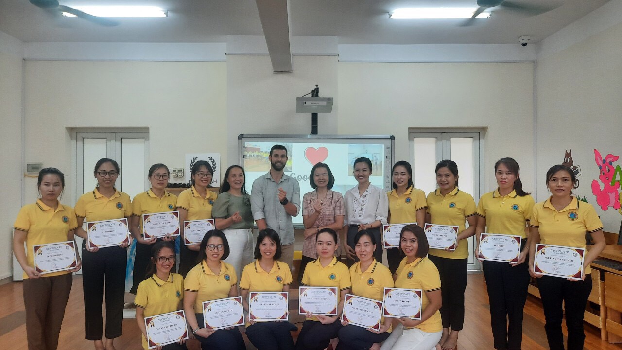 Khóa học “Bồi dưỡng Tiếng Anh giao tiếp cho đội ngũ CBGVNV hè năm 2022” kết thúc, tất cả học viên đều vui mừng khi nhận được giấy chứng nhận hoàn thành khoá học của trung tâm. Trước khi ra về, BGH nhà trường đã chụp ảnh lưu niệm với giáo viên của trung tâm và các học viên. Tất cả học viên, ai cũng nói lời cảm ơn Ban giám hiệu, trung tâm, thầy Mark đã tổ chức lớp học và mong ngày gặp lại ở những khoá đào tạo sau.