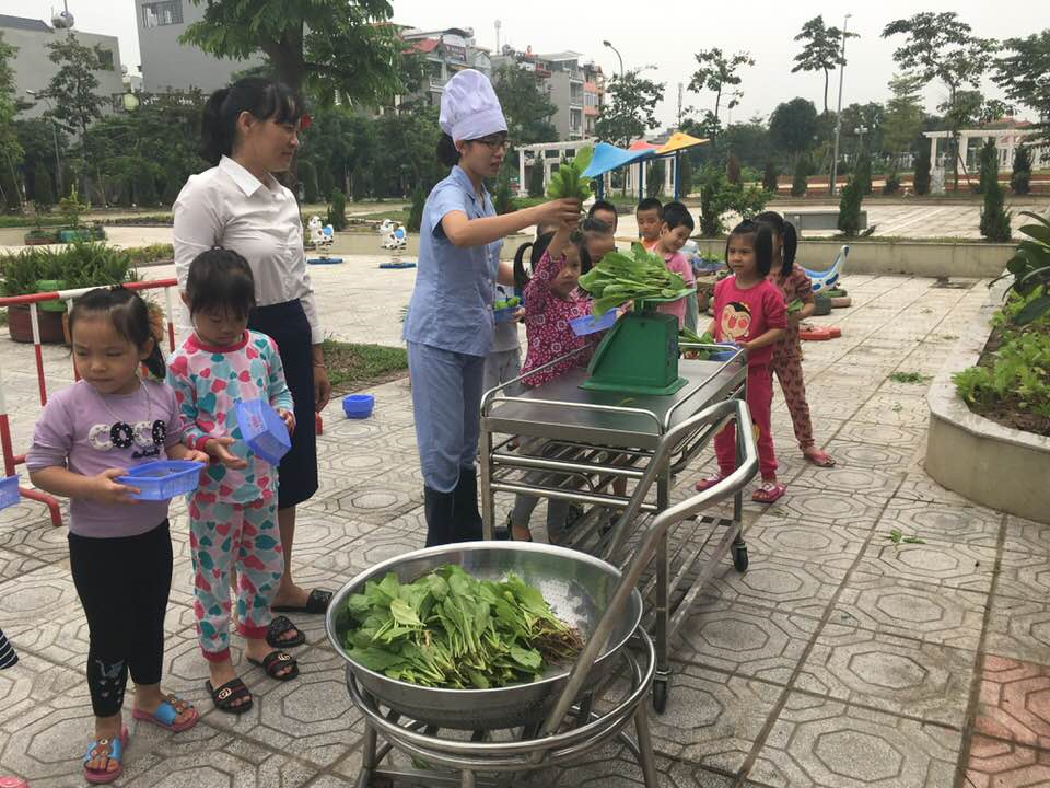 Hình ảnh : Các bé xếp hàng cùng các cô BGH và cô nhà bếp kiểm tra số lượng rau