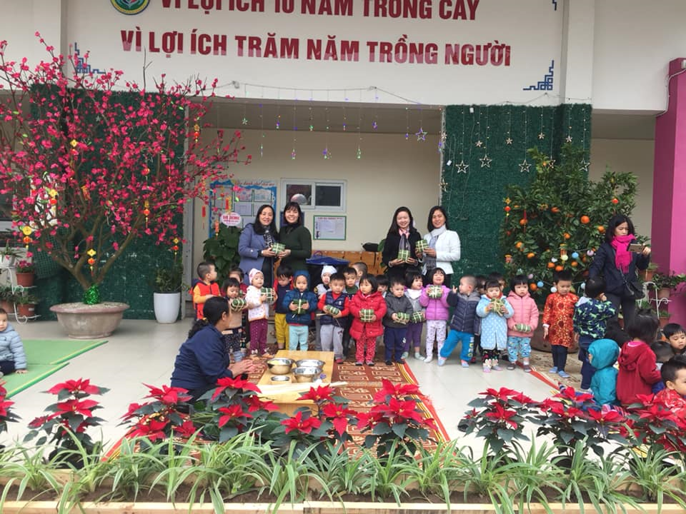 Còn ở trường bé, cô giáo cũng cùng bé và các bạn chuẩn bị không khí đón tết cổ truyền của dân tộc tại lớp nhà trẻ D2 trường mầm non Tràng An như: Treo câu đối, làm cành đào, treo đèn lồng và đặc biệt hơn nữa là các bé được tham gia hoạt động gói bánh trưng cùng với bà và các cô , bé được tìm hiểu về cánh làm bánh trưng và các nguyên liệu để làm bánh lên các bé rất vui và phấn khởi. Với những hoạt động như vậy sẽ giúp các bé hiểu biết nhiều hơn về thế giới xung quanh, đồng thời giáo dục trẻ lòng tự hào về truyền thống văn hóa việt nam và giáo dục trẻ biết giữ gìn phong tục truyền thống trong ngày têt cổ truyền.
