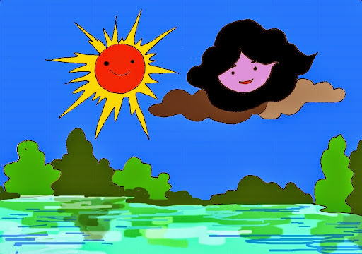 Vào một ngày cuối xuân, những tia nắng đua nhau nhảy nhót trên mặt hồ nước. Mặt hồ lung linh, rạng rỡ dưới ánh mặt trời. bỗng nhiên trời nổi gió. Chị Mây sà thấp xuống mặt hồ. Hồ nước cuộn sóng nói với chị Mây: “Khi có ánh nắng, tôi lóng lánh đẹp hẳn lên, thế mà chị lại che nắng của tôi”. Chị Mây tung tà áo đen kịt và nói: