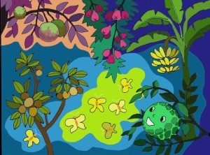 Bé đưa mắt nhìn quanh: Ông Chuối Tiêu đang chăm những quả chuối mập vàng; bà Hồng Xiêm quanh năm cần mẫn với chiếc áo nâu bạc phếch; cô Vú Sữa tròn trịa e ấp giấu mình trong những tán lá tím sẫm với những hạt sương long lanh muôn sắc màu bởi ánh nắng mặt trời buổi sớm; kia nữa, các cô bướm chuẩn bị những chiếc áo vàng tươi như đi xem hội và chị Hồng mới rực rỡ làm sao trong chiếc áo màu đỏ; còn những anh Roi Đường nghịch ngợm đu tít trên cành cao với bao trò chơi con trẻ.
